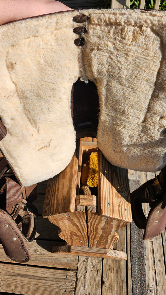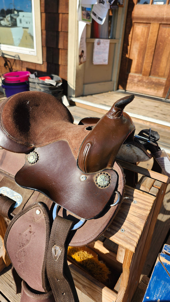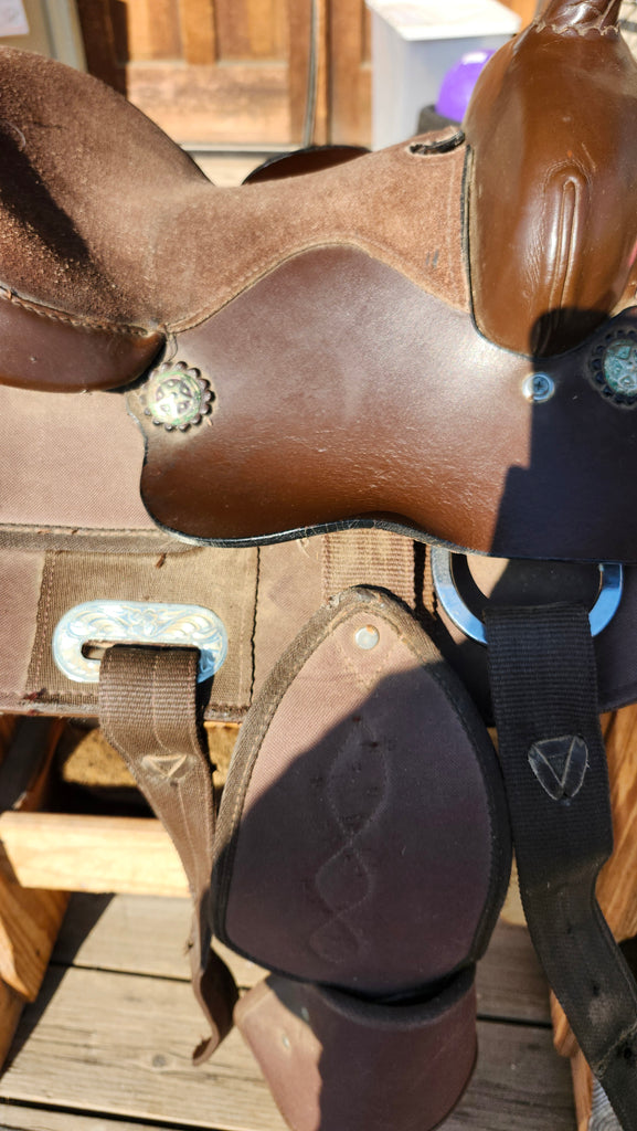 This is a Tough 1 Eclipse Crypton Western Saddle in fair used condition. The jockeys on this saddle are curling up, but could be trained back down. It comes equipped with a latigo, off billet, and rear cinch