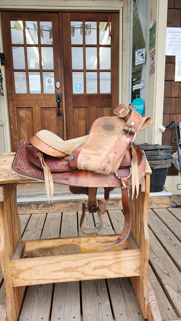 This is a well used 12" Ozark Leather Western Saddle, but is in good conditon. Great for a starter saddle for your kiddo! Comes with a latigo and off billet.