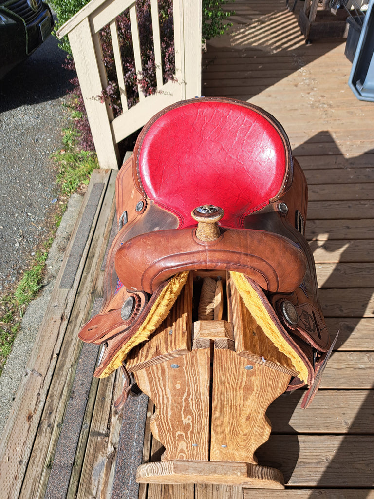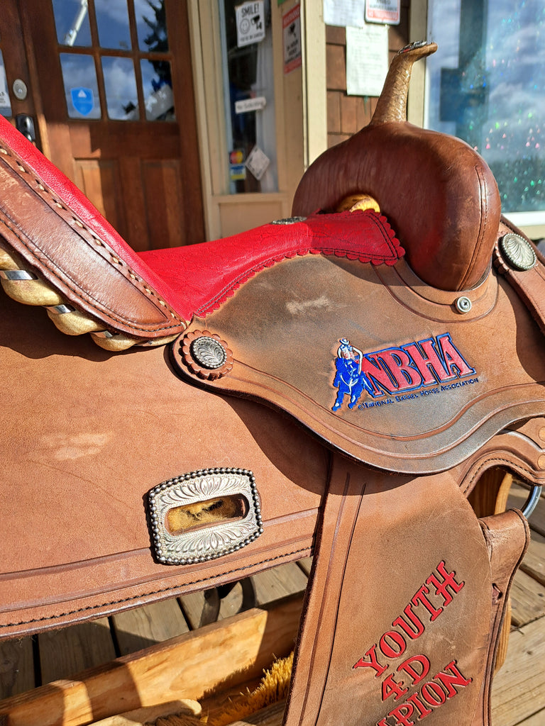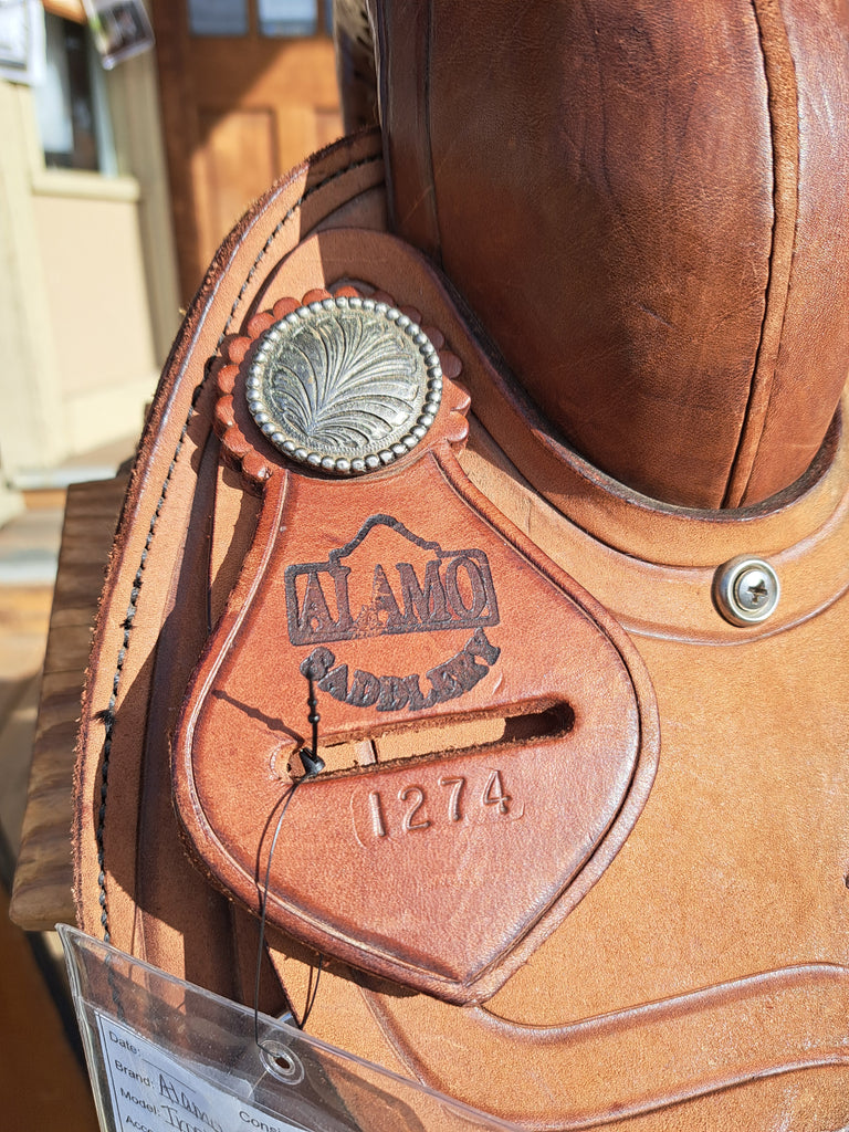 This Alamo Trophy Barrel Saddle has been well cared for and is in good used condition. It features full rough out, with a red elephant seat. It comes with an off-billet and a latigo.