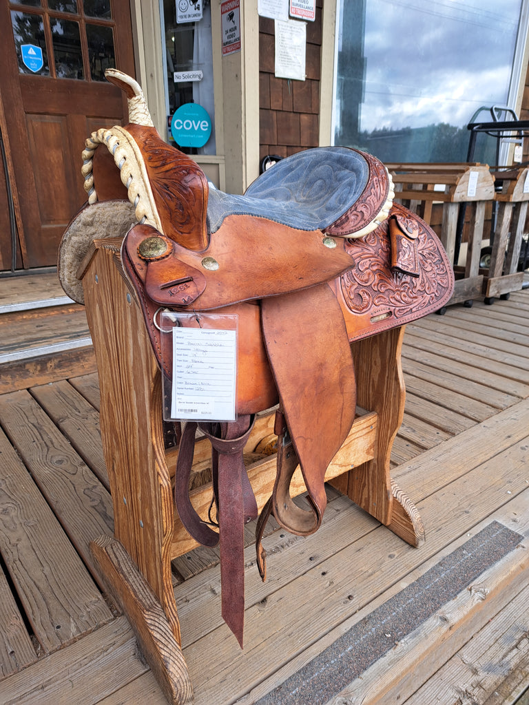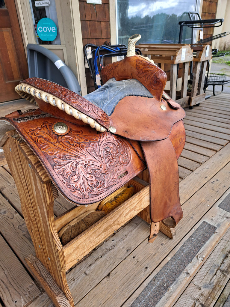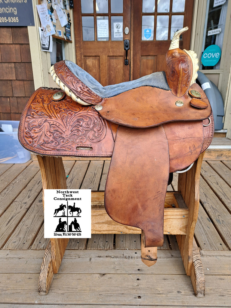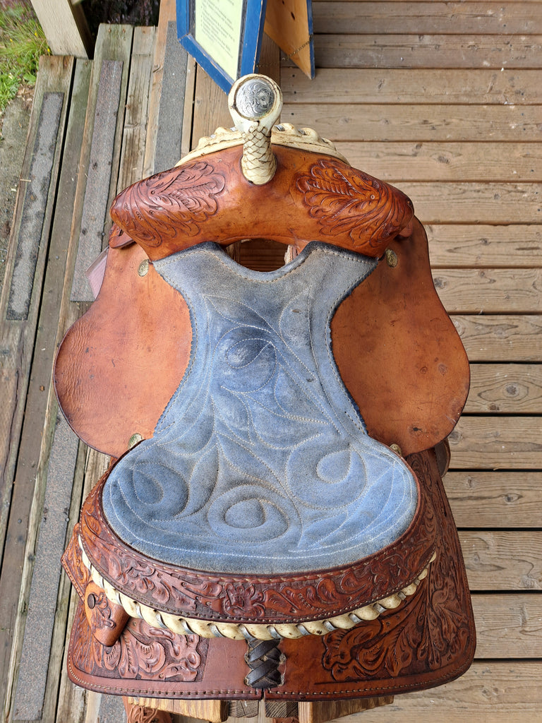 This is a Barrel racing saddle with no makers mark or brand. This saddle would a good option for a beginning rider looking to get into speed events or wanting a more secure seat. It comes equipped with a latigo.