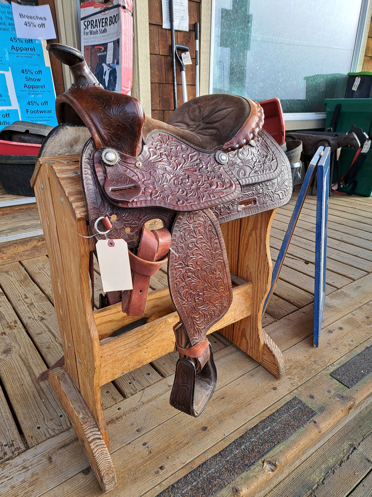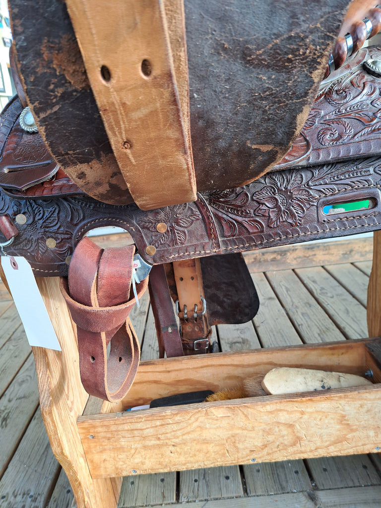 This is a The American Western Pleasure Saddle in good used condition. While it is an older model, it is well made and has plenty of rides left in it. It comes equipped with a latigo and off billet.