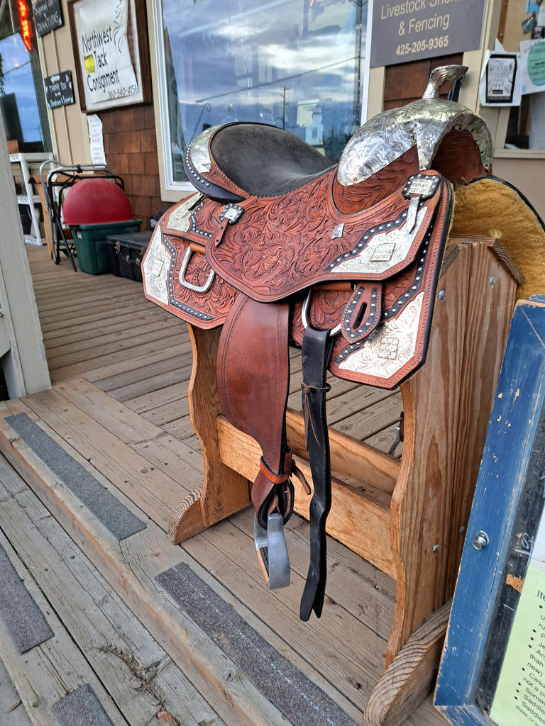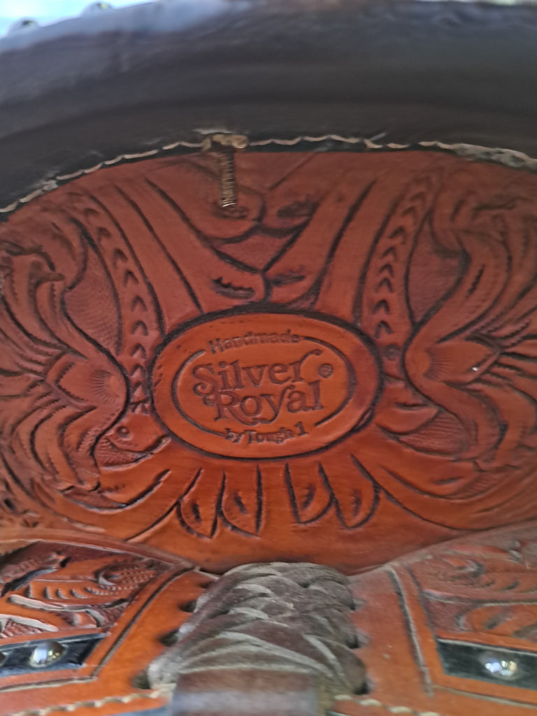 This is a TOugh 1 Silver Royal Extreme Silver show saddle in good used condition. This would be a great option for a junior rider looking to show their horse. It features attractive silver accents and floral tooling. This saddle comes equipped with a latigo and off billet.