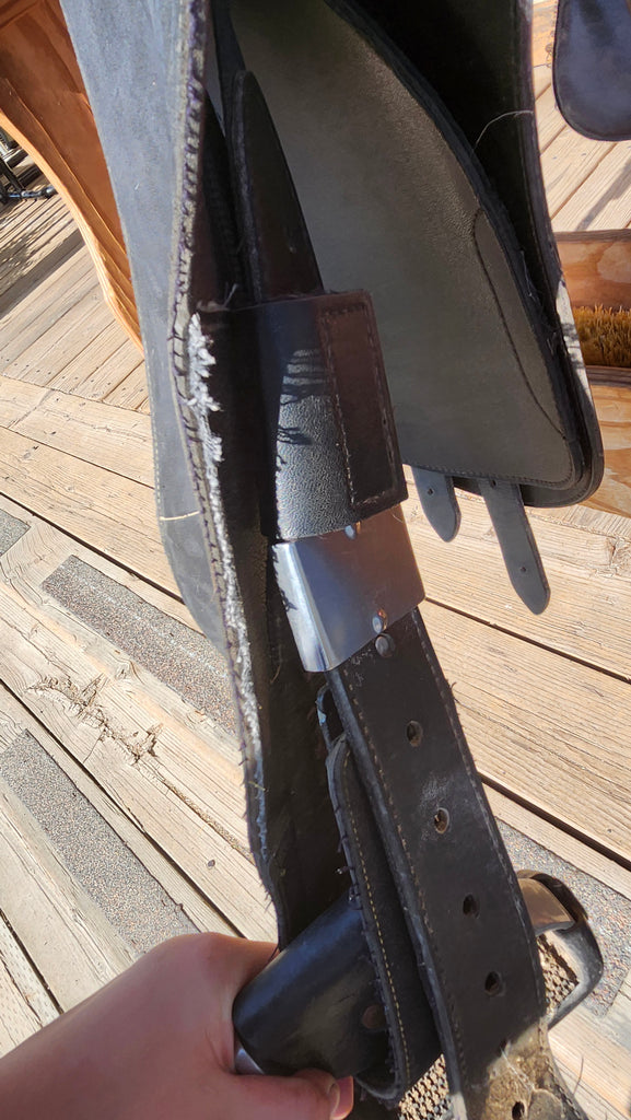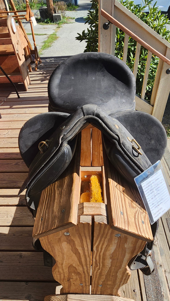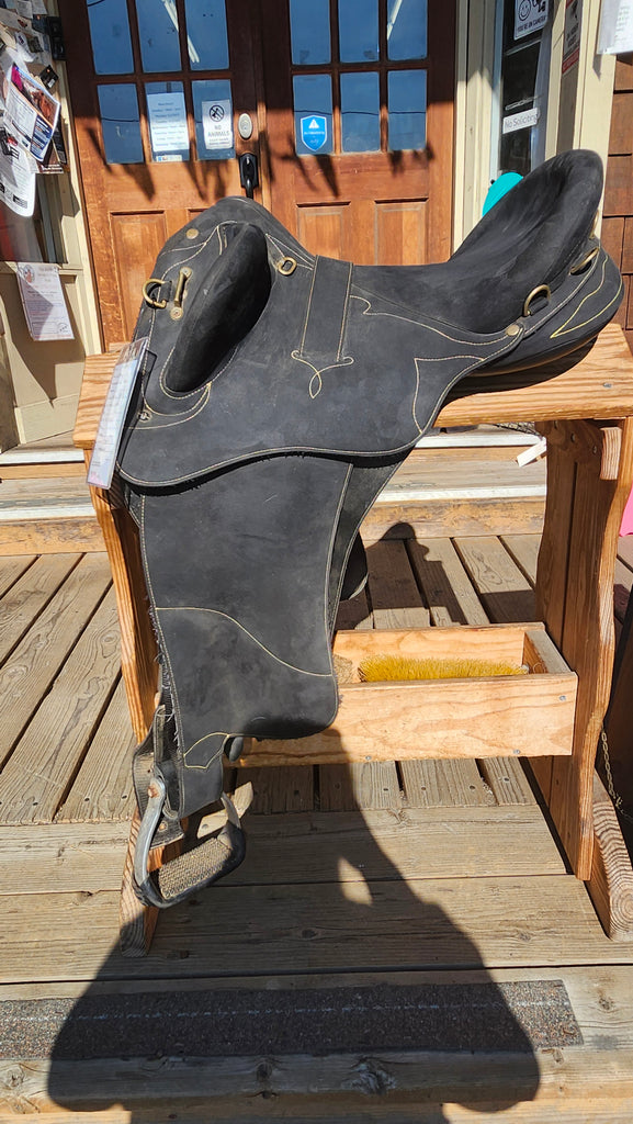 This is a Wintec Australian Stock Saddle in fair used condition. This saddle featuers an exchangeable gullet system and CAIR panels. It comes with fenders and stirrups.