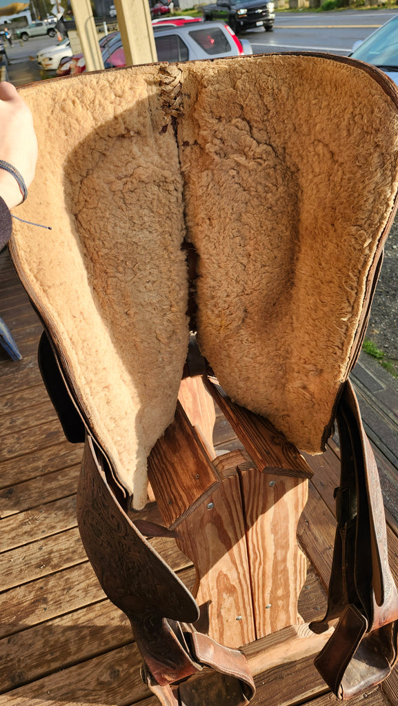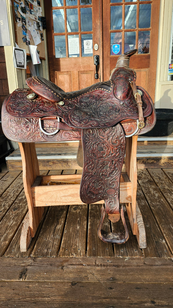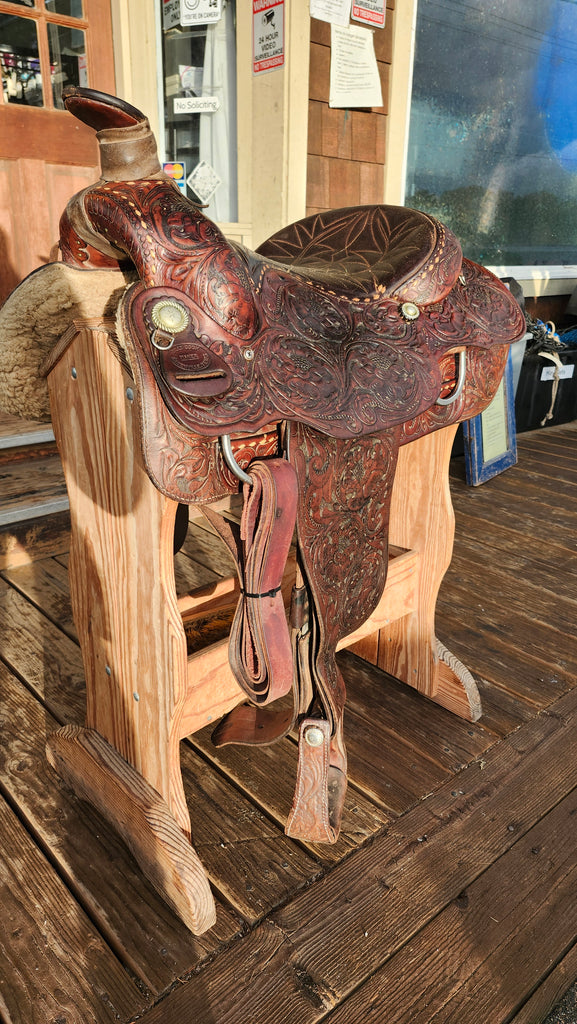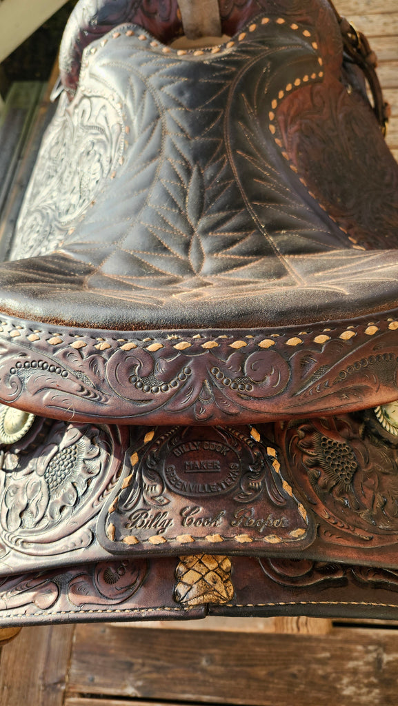 This is a vintage Billy Cook roping saddle in great shape for it's age. It features lovely floral tooling, and soft and supple leather. It comes equipped with a leather latigo.