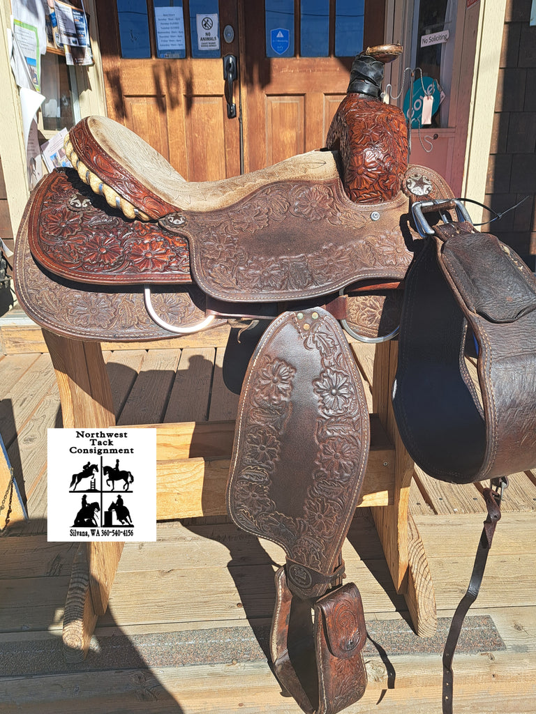 This is a Masters All Around Roping Saddle in great used condition. This saddle features a stunning combination of roughout, floral tooling, and rawhide accents.