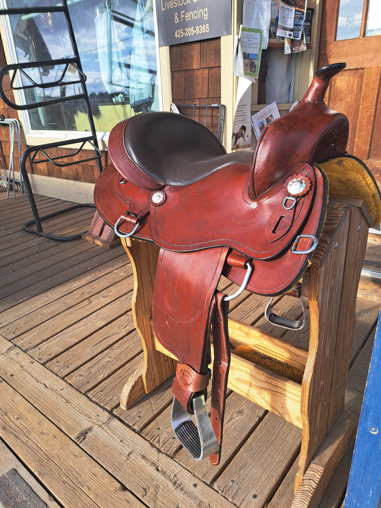 This simple styled saddle will be intrinsic for your riding for years to come. The glossy leather and dark saddle seat combined with a round skirt and simple silver conchos give this saddle a timeless look. The Drop D rigging removes some bulk around your leg.