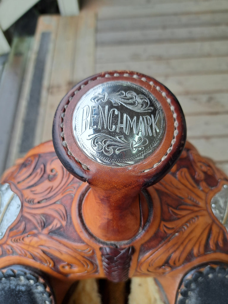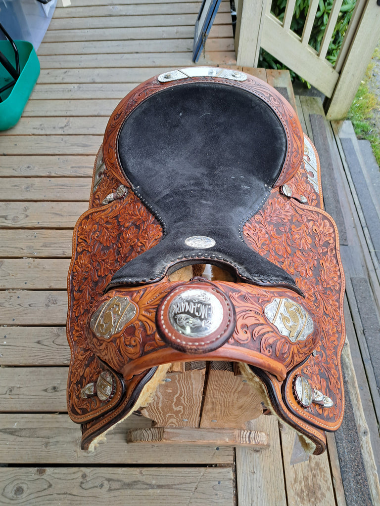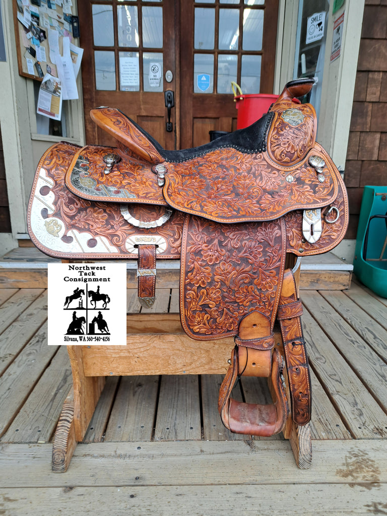 This is a Billy Cook Longhorn Western Equitation Show Saddle in good used condition. This saddle features attractive floral leaf tooling with silver accents. It comes equipped with a latigo and off billet. We don't see a lot of show saddles come in in a 15" seat, so if this is your size, don't wait!