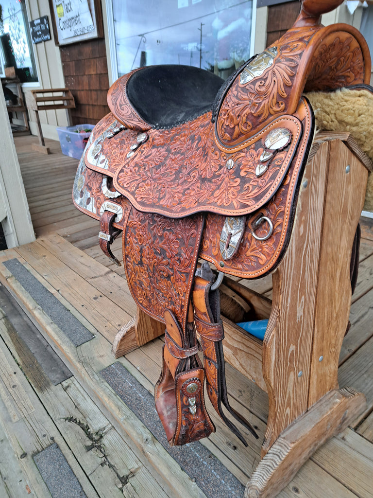 This is a Billy Cook Longhorn Western Equitation Show Saddle in excellent used condition. This saddle features lovely floral tooling with silver accents. It comes equipped with a latigo, off billet, and silver adorned flank straps.