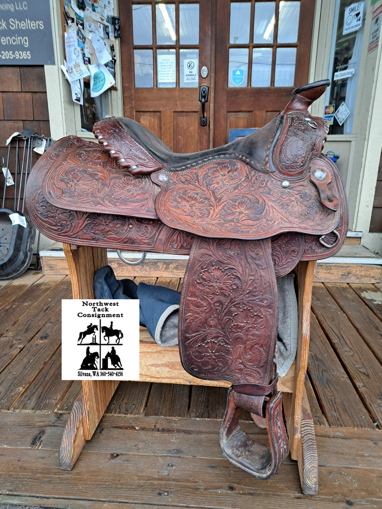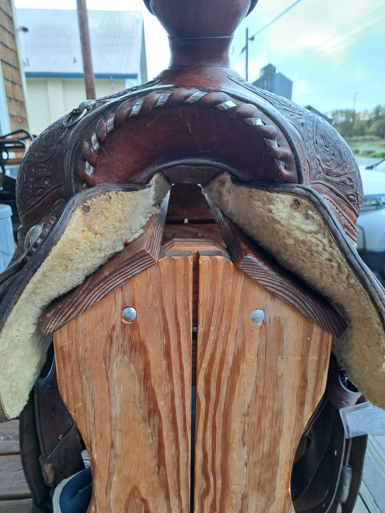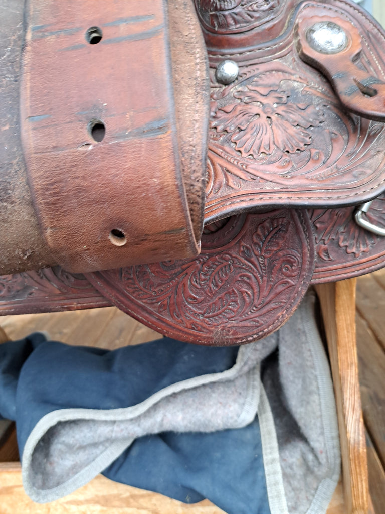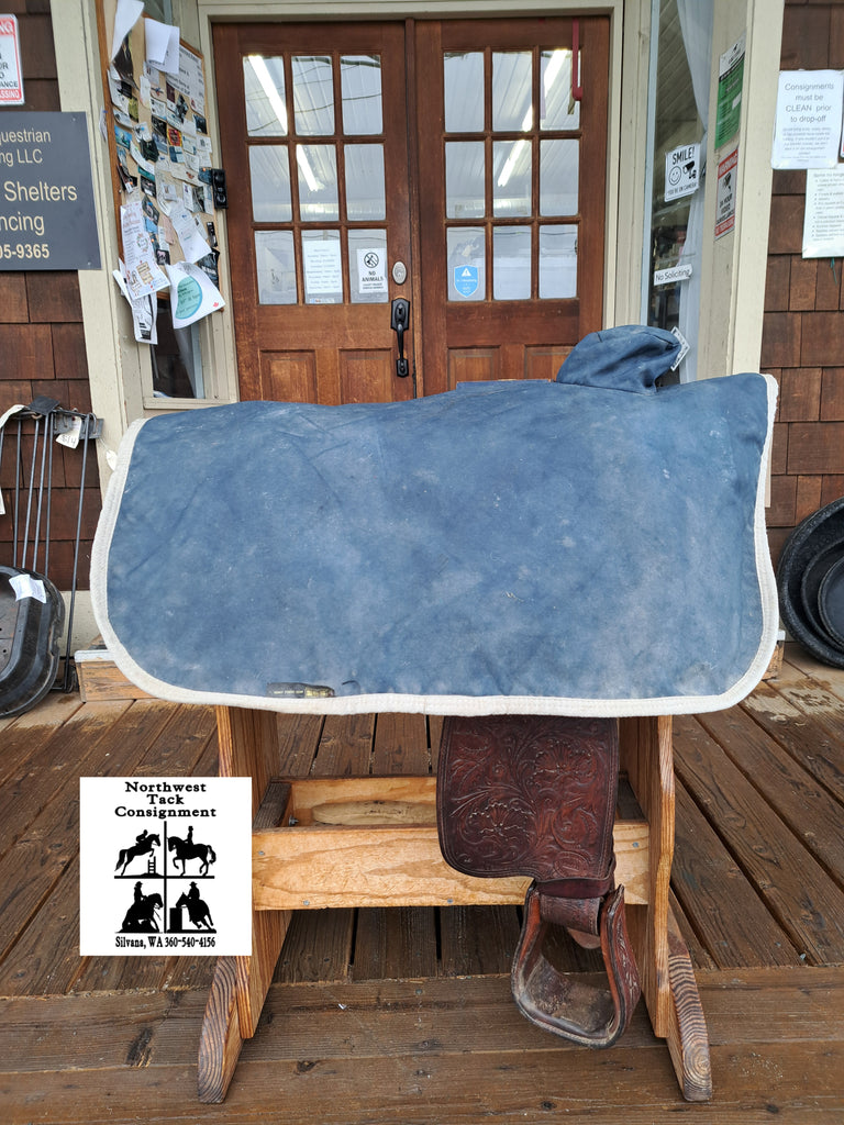 This is a Billy Cook Western Equitation show saddle in fair condition. This saddle has unfortunately had some damage to it's fleece (see picture), which is why it is at a bargain price. This would be a great investment piece! It comes equipped with a leather latigo and a blue cover.