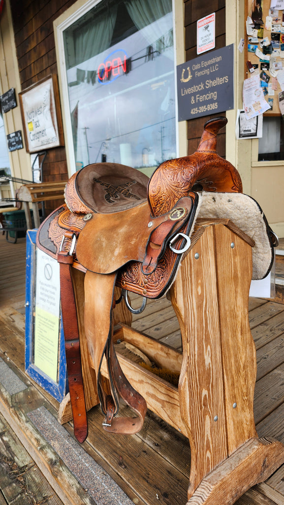 This Circle Y High Horse Barrel Saddle has been well cared for and is in good used condition. It features wire wrapped rawhide cantle, floral tooling, pistol conchos, and elephant inlay. It comes with flank straps.