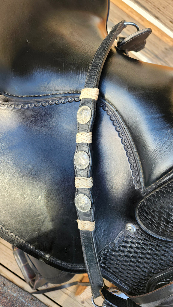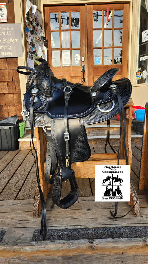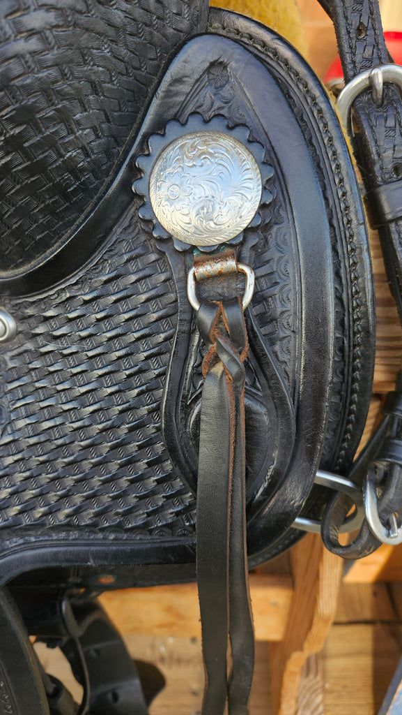 This is a Classic Crates Round Skirt Trail Saddle in excellent used condition. This saddle is sure to please with basketweave stamping and silver conchos. It comes equipped with a bridle, breast collar, latigo, and off billet.