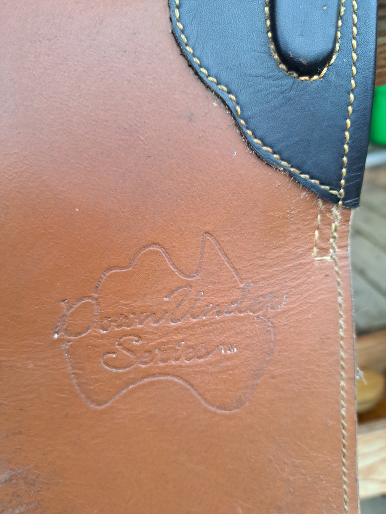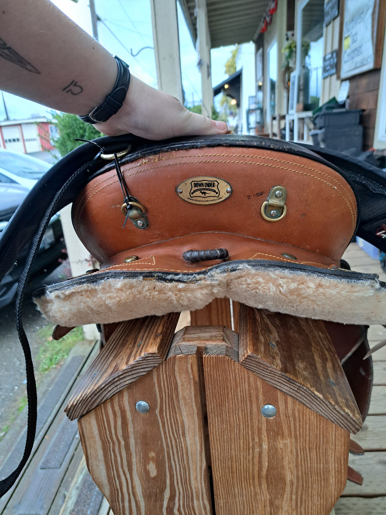 This is a Downunder Saddlery Australian Stock Saddle in good used condition. This saddle is a great option for rider's looking for a hybrid english and western trail saddle. It comes equipped with a girth, overgirth, stirrup leathers, and irons.