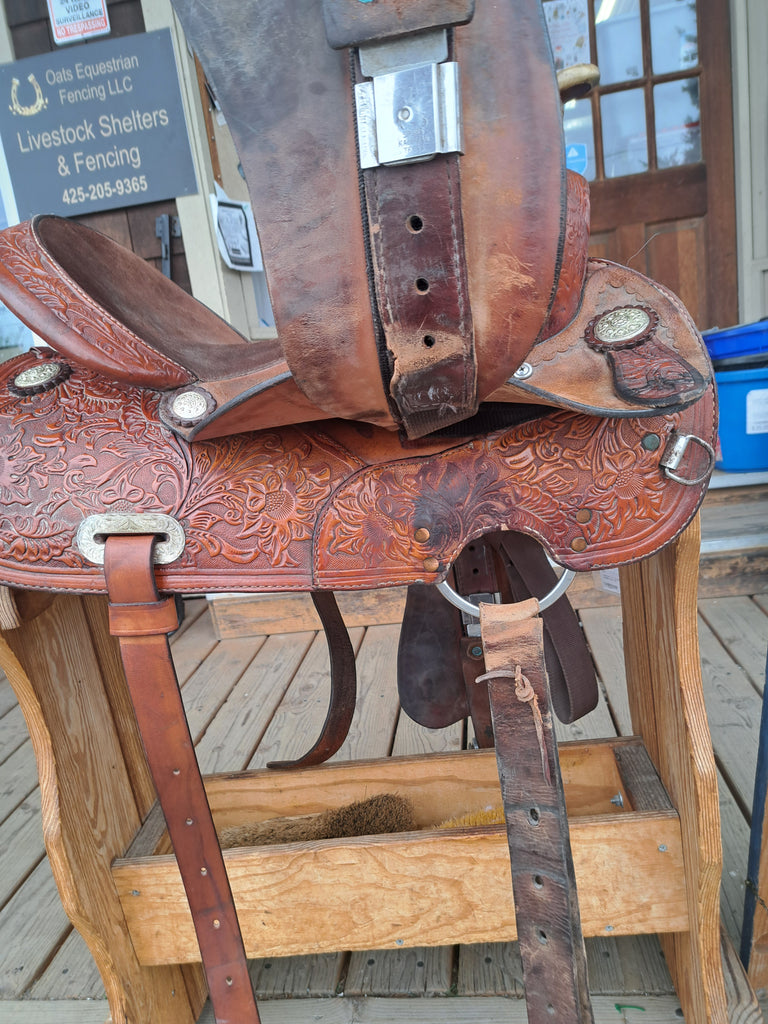 This is a Hereford Tex Tan Barrel Racing Saddle in good used condition. This saddle features attractive floral tooling and adorned conchos. It comes equipped with a latigo, off billet, and flank straps.