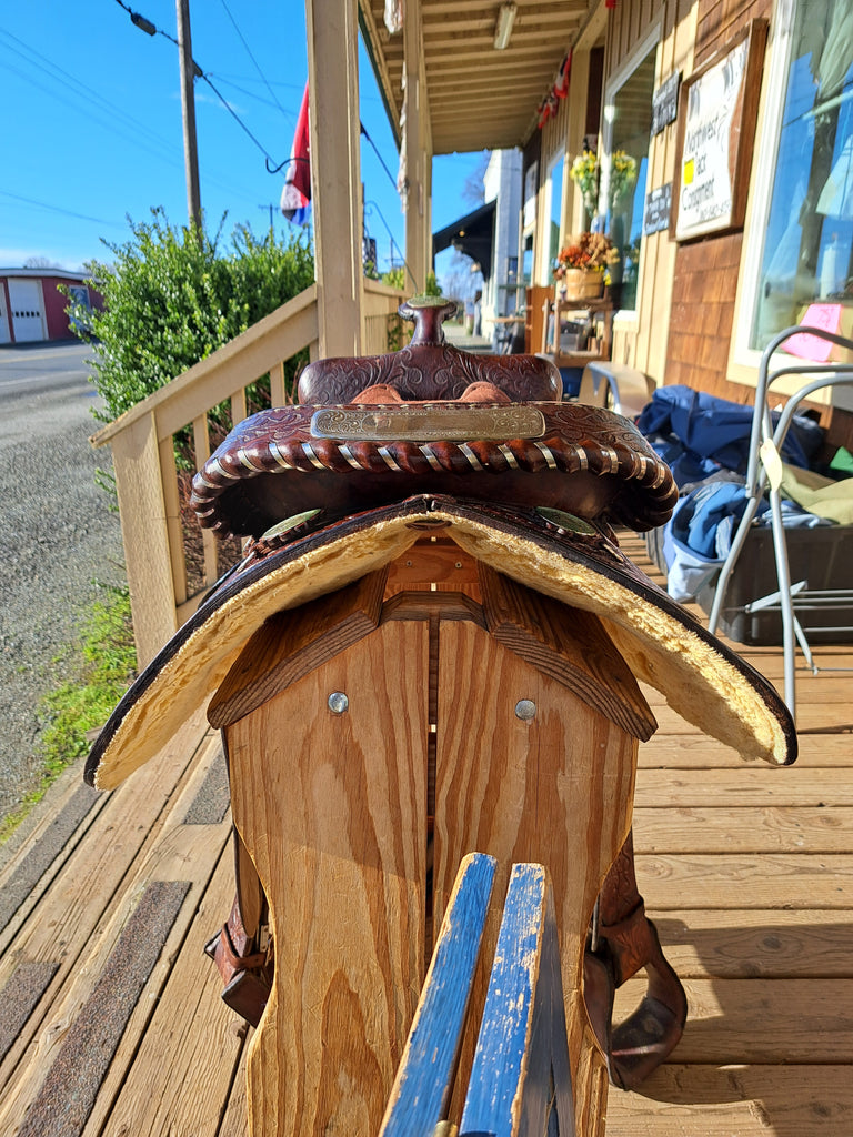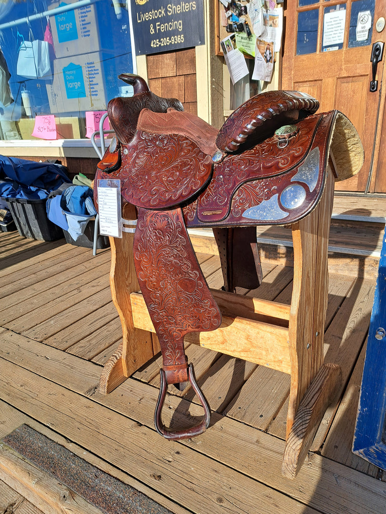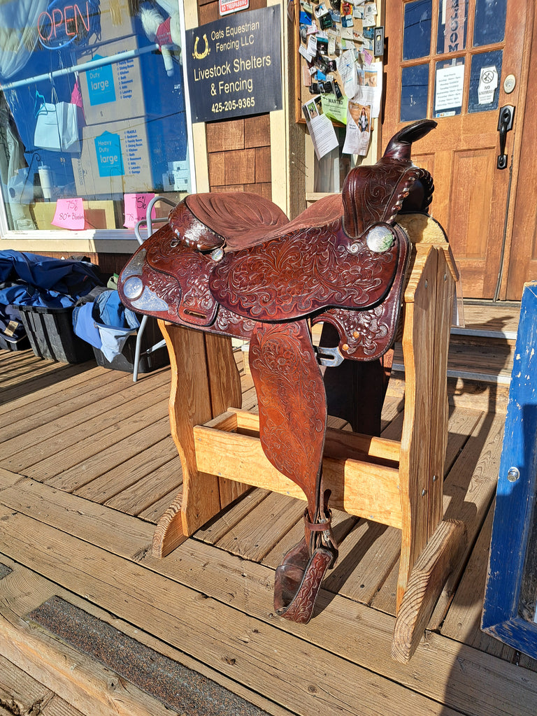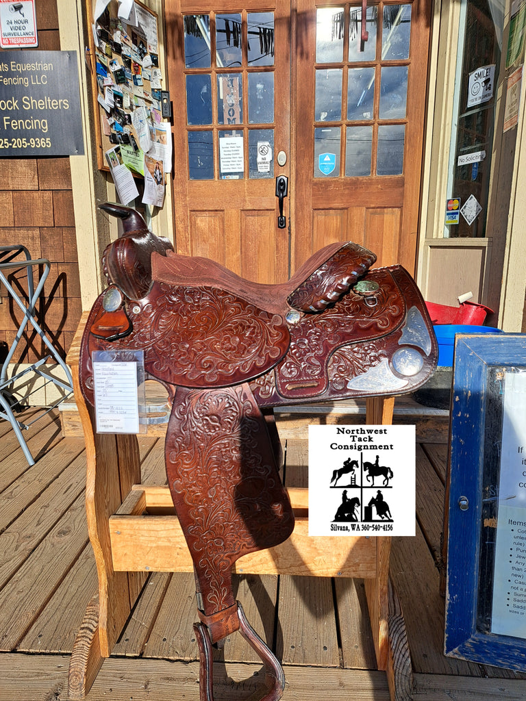 This vintage Hereford Tex Tan Equitation Saddle has been well cared for and is in great used condition. The fleece is in excellent condition, and the leather is soft and supple. It features detailed floral tooling, silver conchos, and wire wrapped cantle and pommel.