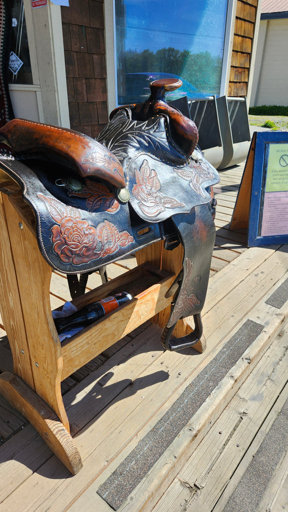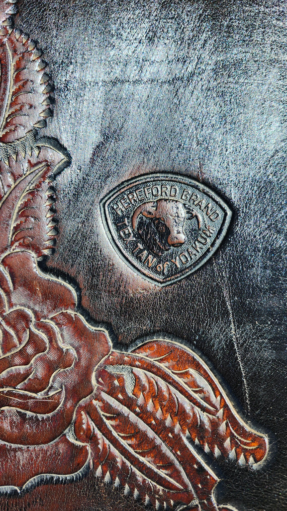 This is a Hereford Tex Tan Western Saddle in fair used condition. This saddle has attractive two toned leather with floral tooling. It comes equipped with a latigo. A bit of elbow grease would make this saddle shine!