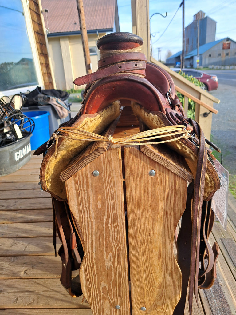 This 15" McCall Wade Ranch Saddle is in great used condition. This saddle is exceptionally well made, and is built to last. This saddle comes with a padded seat inlay and round skirt. It comes equipped with a latigo, off billet, flank straps, and a rear cinch.