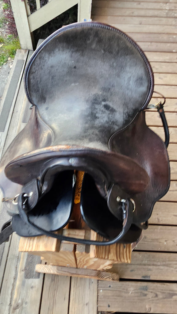 This is a Ortho-flex saddle that we have never seen before. It looks to be a type of endurance , and has a large rounded pommel. It is rigged up for western rigging, and comes with a latigo and off billet. This saddle is a bit of an older model, and with that comes some cosmetic scratches.