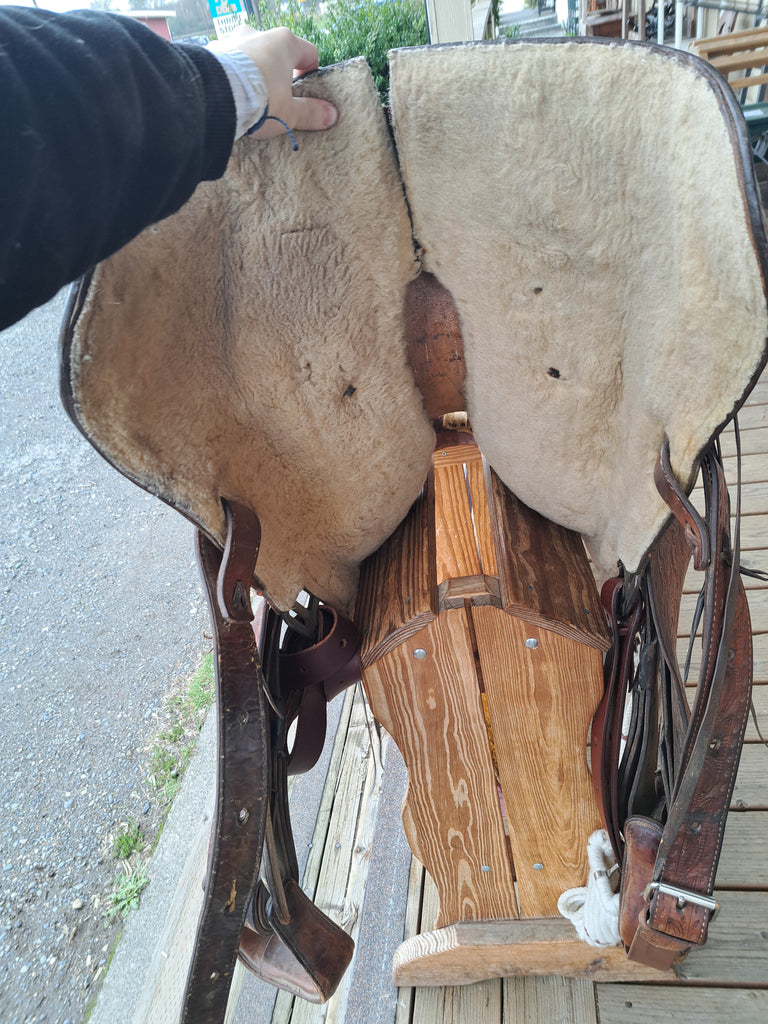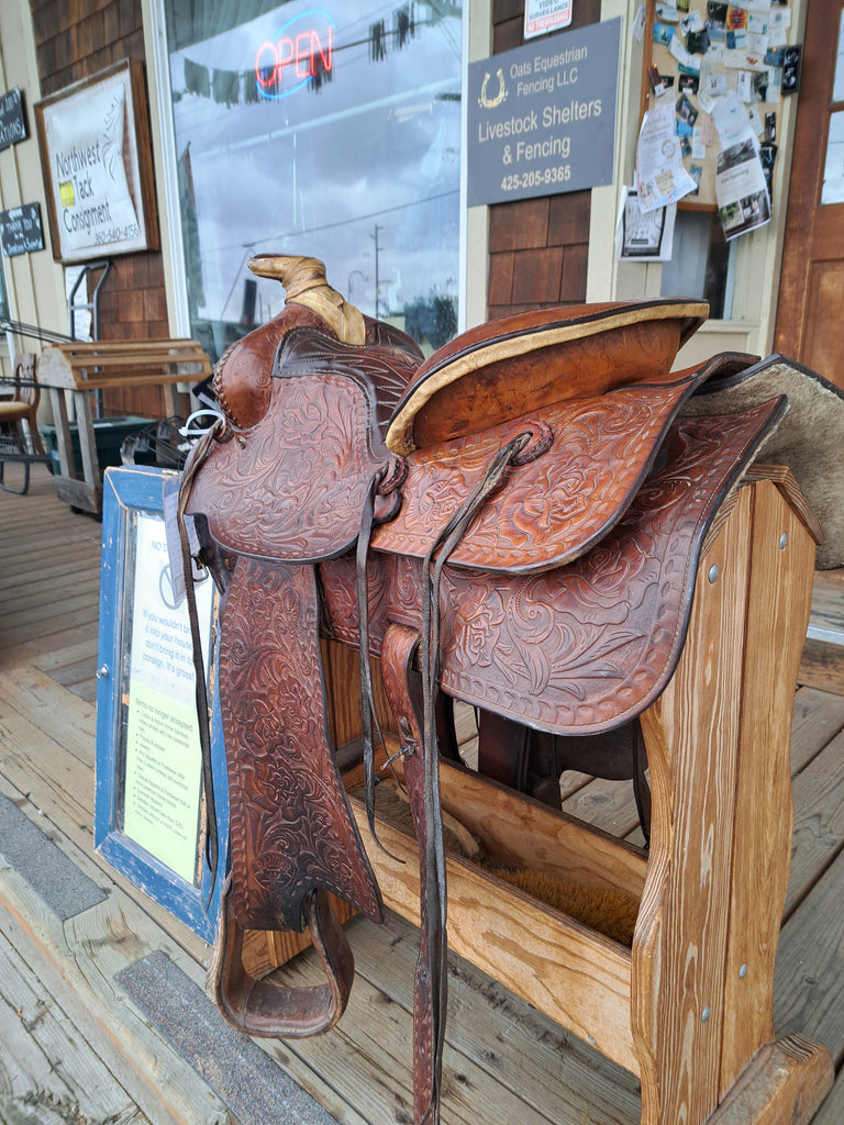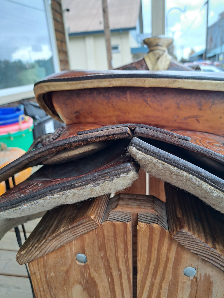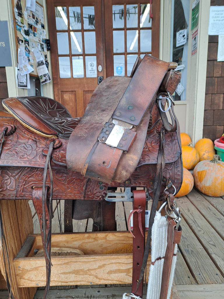 This Ranger by Big Horn Ranch / Trail Saddle is an older model that has been well loved and cared for. It features floral tooling and a rawhide wrapped horn. It comes with a latigo, off-billet, cinch, and rear cinch.