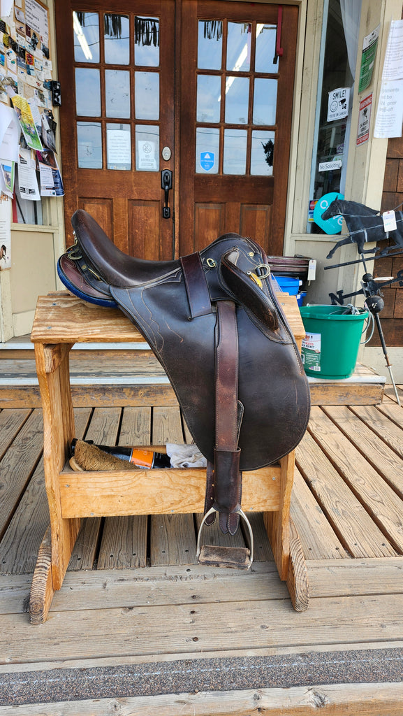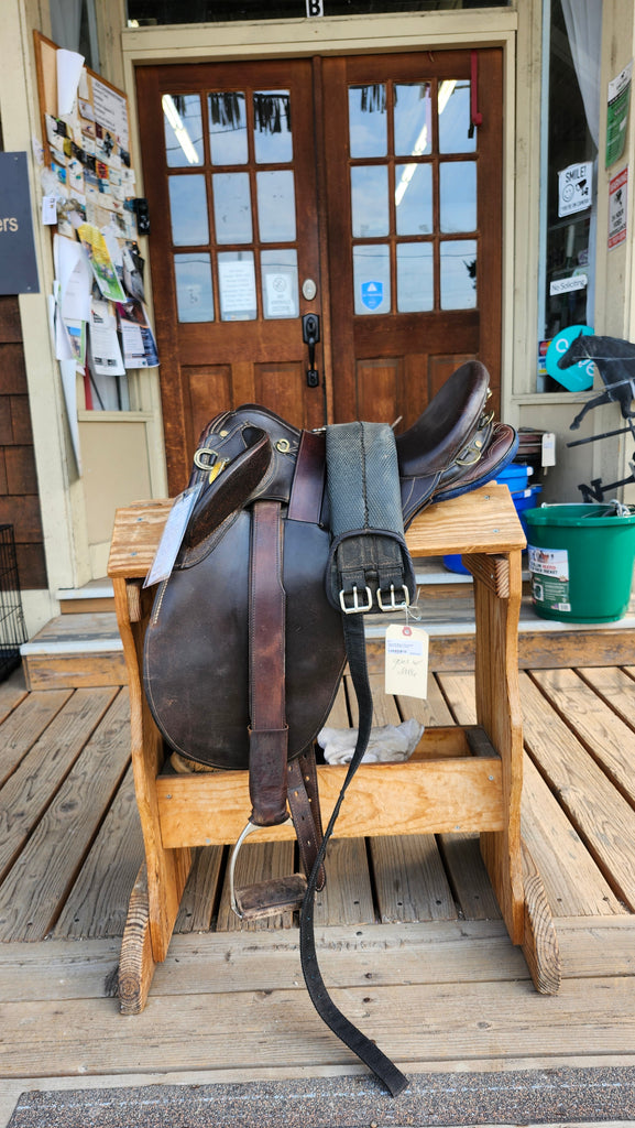 This is a Syd Hill Sierra Poley Australian Saddle in good used condition. These saddles are well made, and built to last. It features wool flocked panels. It comes equipped with a neoprene cinch, stirrup leathers, and irons.