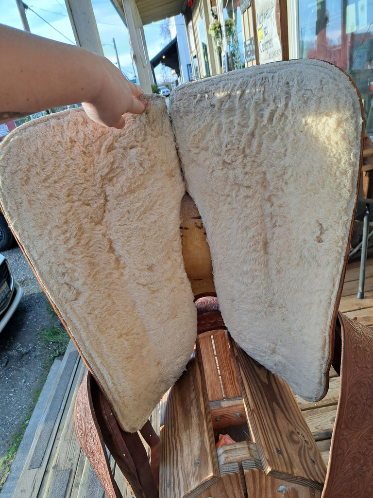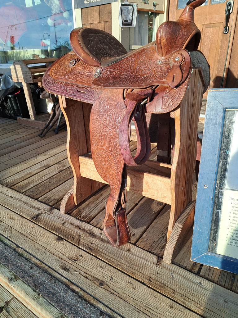 This Vintage Keyston Western Saddle has been well cared for and is in great used condition. It features a rough out seat, floral tooling and comes with 2 latigos.