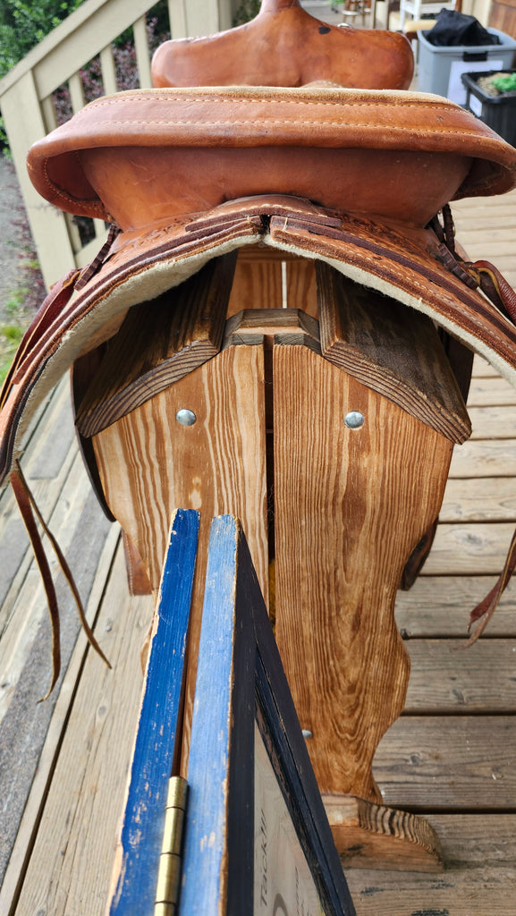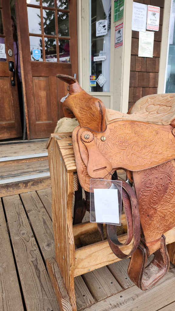 This is a Western saddle with no makers mark or brand. This saddle is made with good quality leather and has a lot of character in its floral tooling. We did note that it has some separation on the left side of the skirt near where you would put a flank strap. It comes equipped with a latigo and off billet.