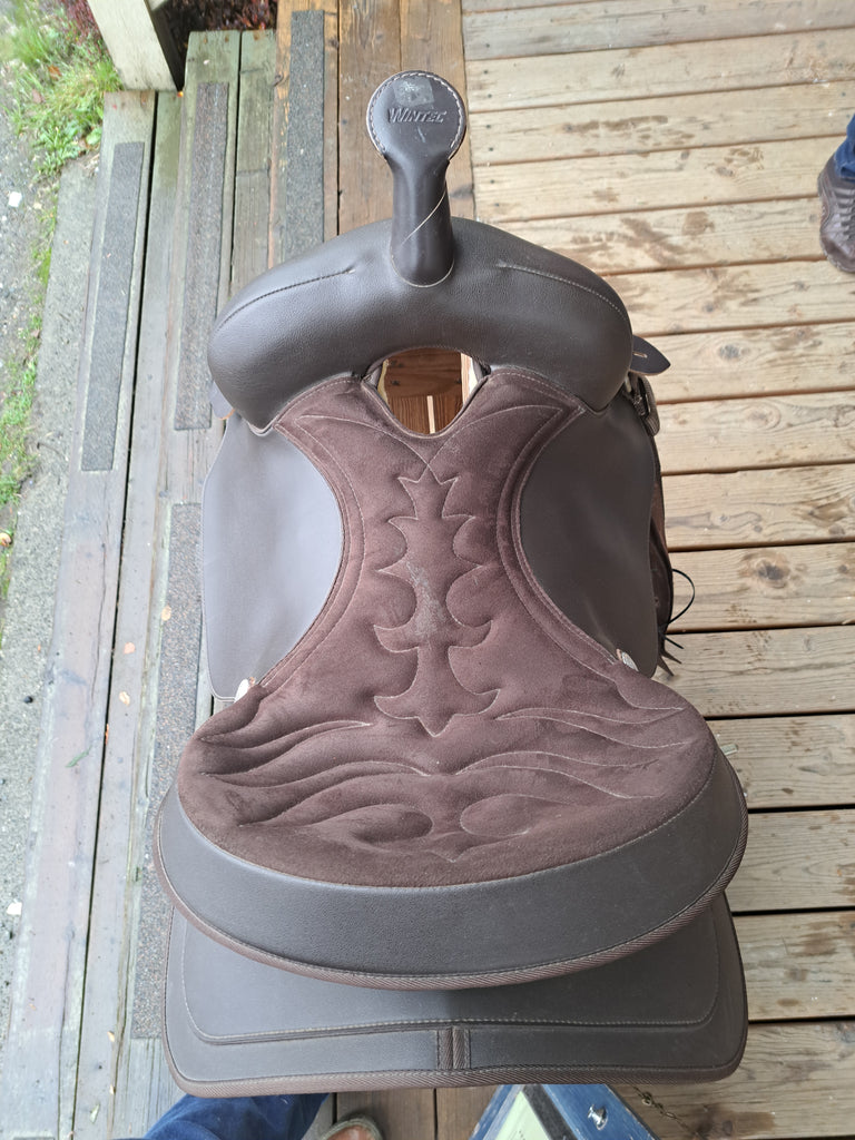 This is a Wintec Synthetic western saddle in great used condition. This saddle is a great option for rider looking for a lightweight and rugged option. It comes equipped with a latigo, off billet, and rear cinch (no flank straps)