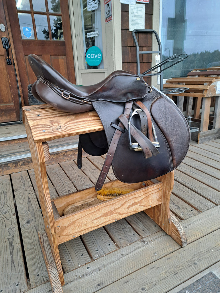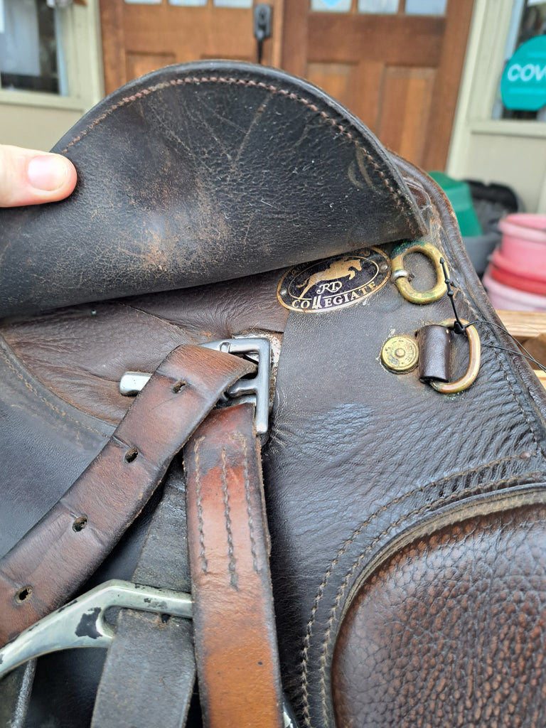 This Collegiate All Purpose Saddle has been well loved that has many miles left in it and would make a great schooling saddle. It shows minor cosmetic scratches in the seat. It comes with leathers and irons.