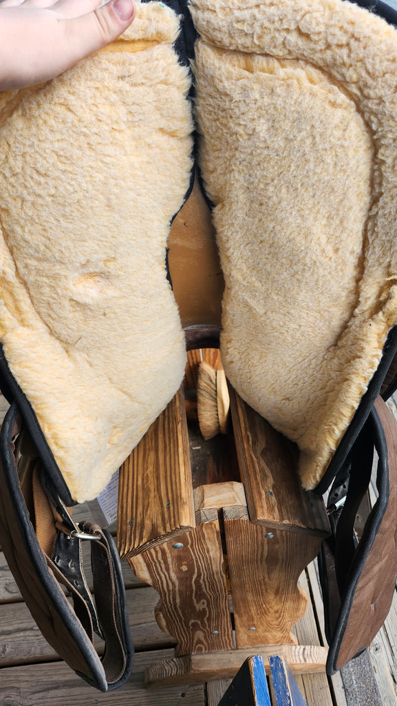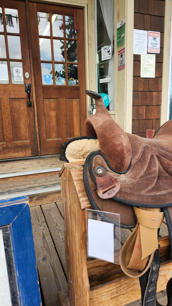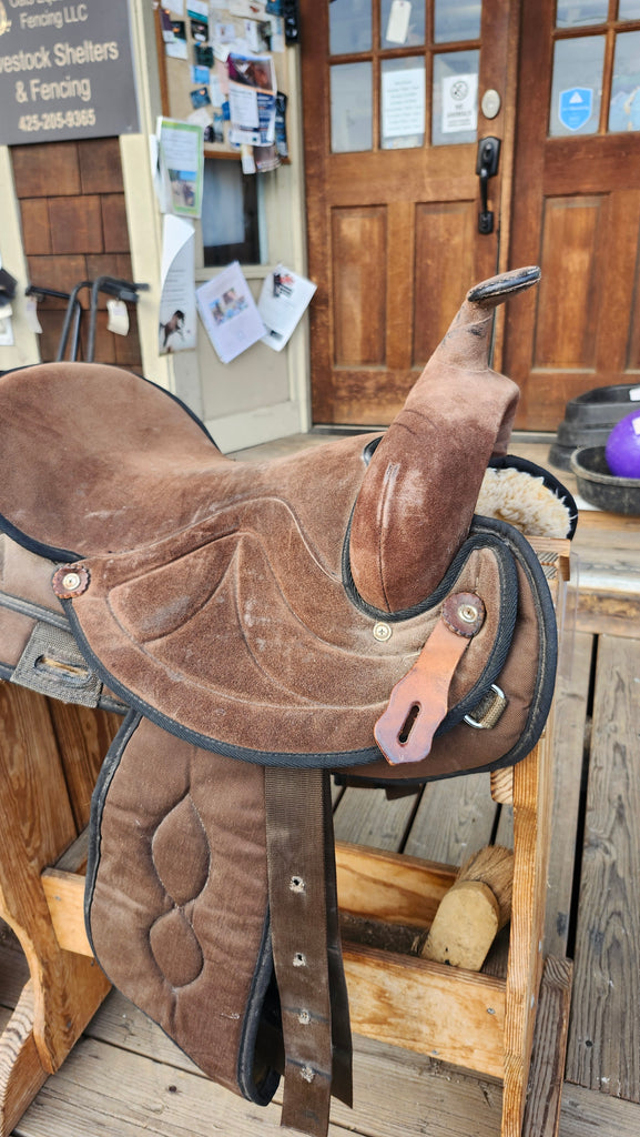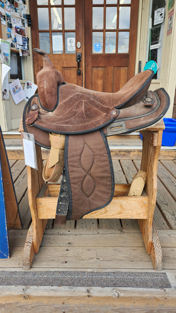 This is a Big Horn Synthetic Western Saddle in good used condition. This saddle is a great option for someone looking for a lightweight and durable saddle that can withstand the elements. It comes with a latigo and off billet, but does need stirrups. We have a lot of stirrups for sale in store that can be purchased separately.