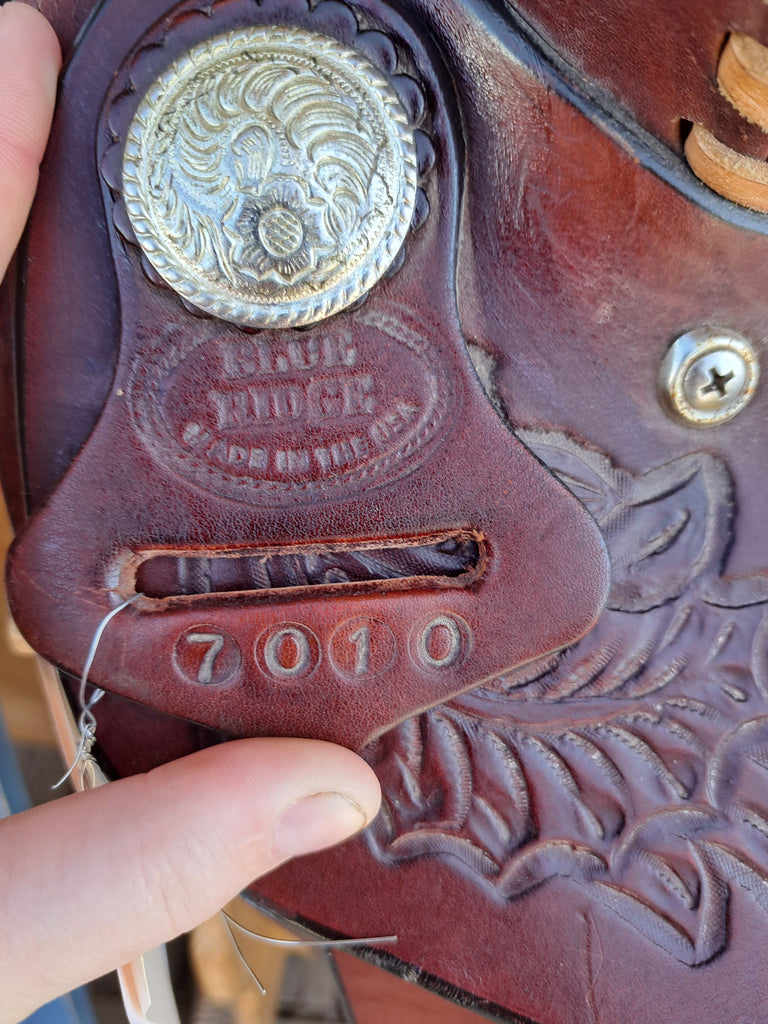 This is a Blue Ridge Barrel Racing Saddle in good used condition. This saddle does have some scuffs on it, but it is in great shape otherwise. It comes equipped with a latigo and off billet.