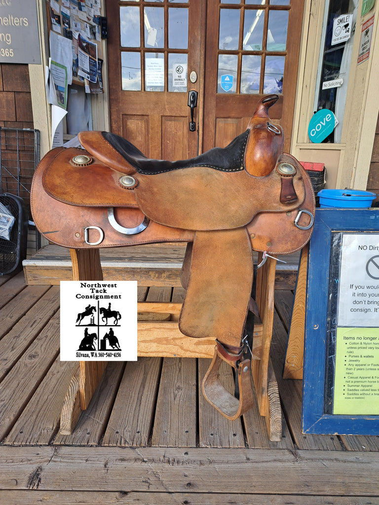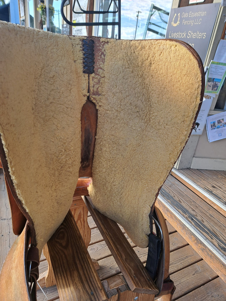 This Bobs Trainer Saddle has been well loved and is in good used condition. It does show wear in the fleece near the back of the skirt. It comes with a latigo, and an off-billet.