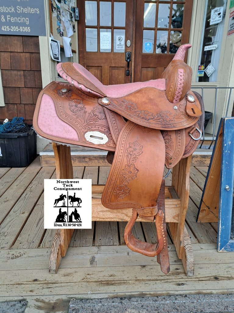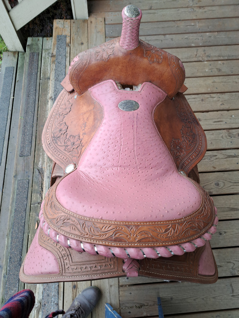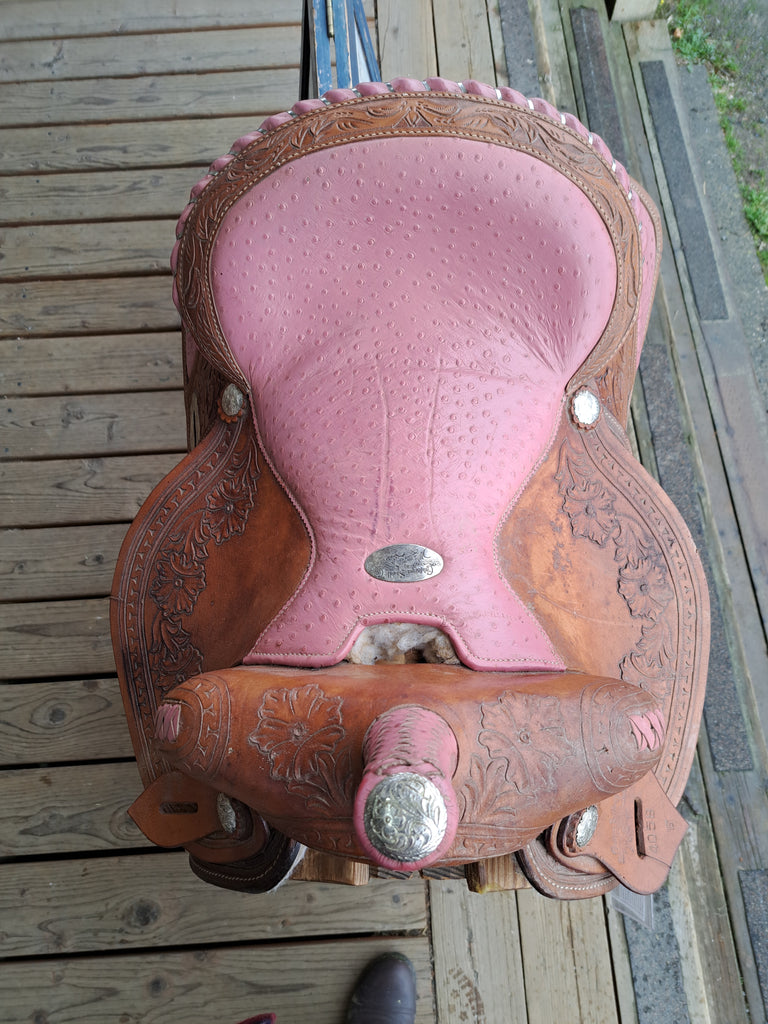 This is a California Saddle Co Barrel Saddle in good used condition. This saddle features a pink ostrich leather style seat and a wire wrapped cantle. It comes equipped with a latigo and off billet.