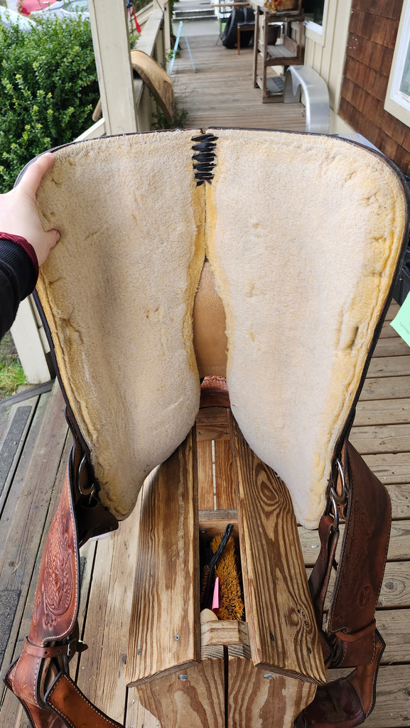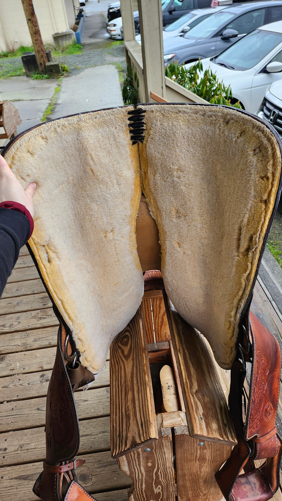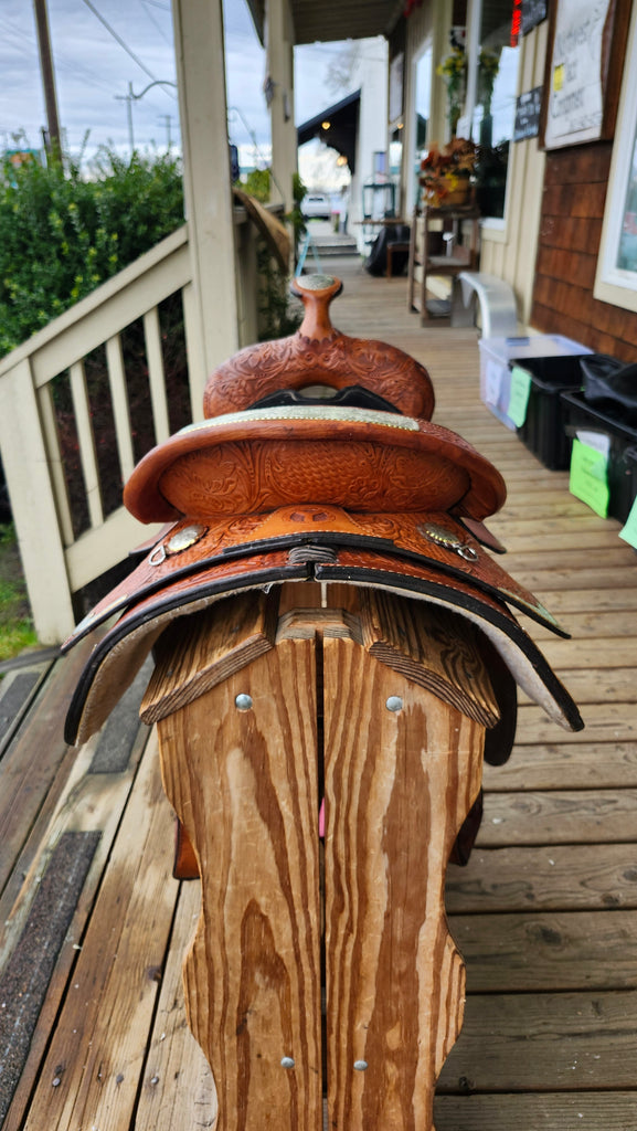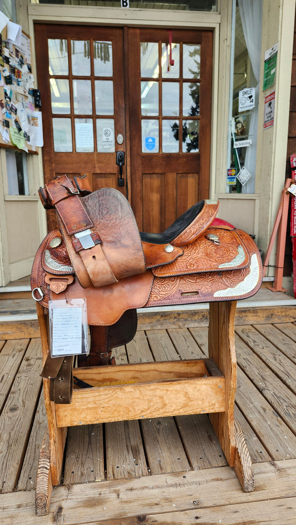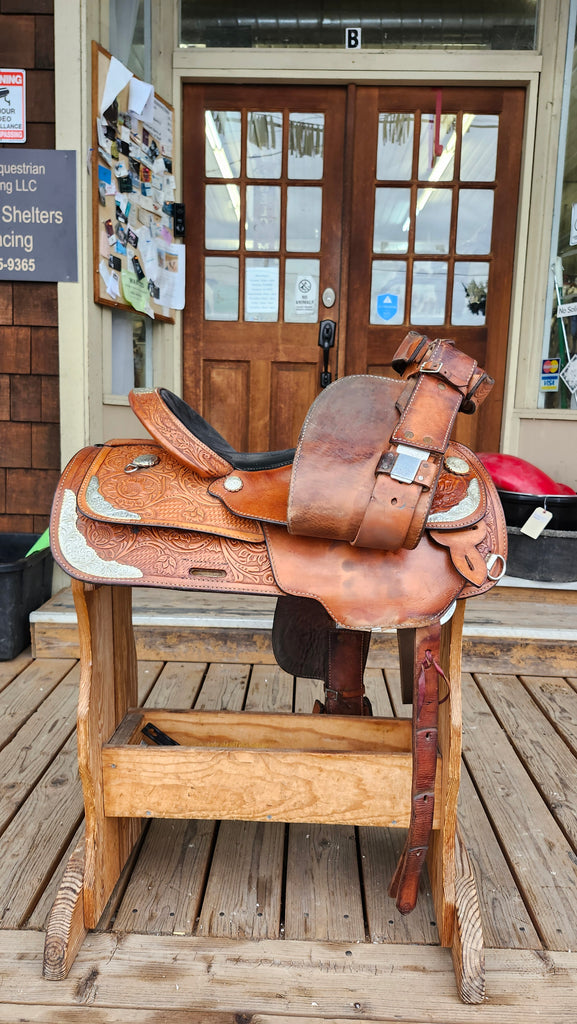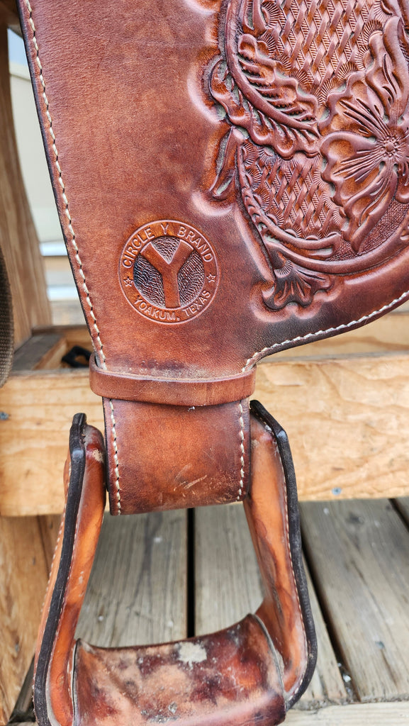 This is a Circle Y Western Equitation Show Saddle in good used condition. This saddle features attractive floral tooling with basketweave accents and silver plating. It comes equipped with a latigo and off billet.
