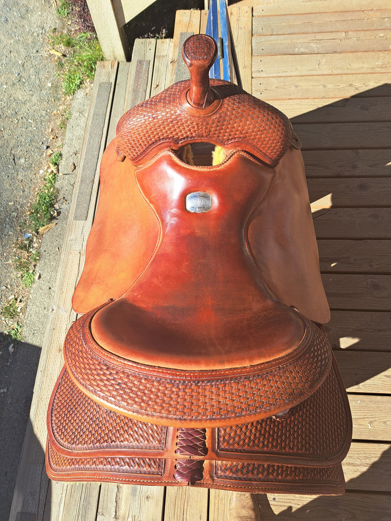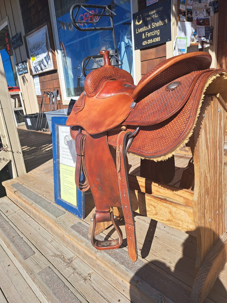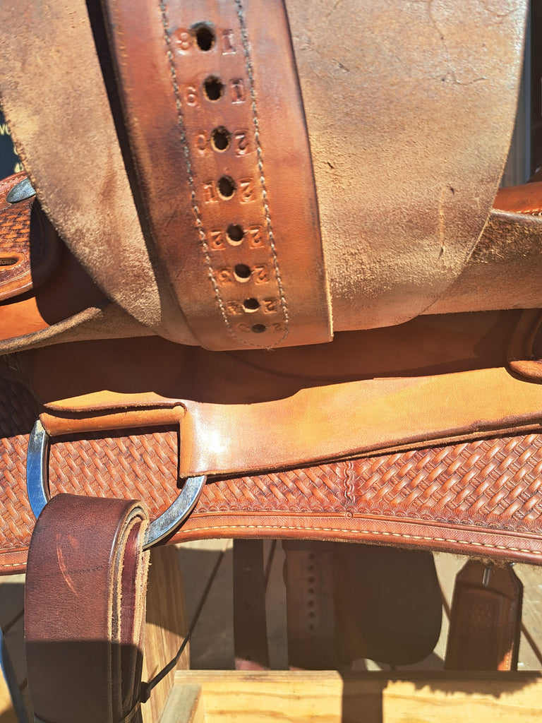 This Cowhorse Equipment Cowhorse Saddle has been well cared for and is in good used condition. It features attractive basketweave stamping with silver concho accents. It comes equipped with nettles stirrups, and a latigo, and off-billet.