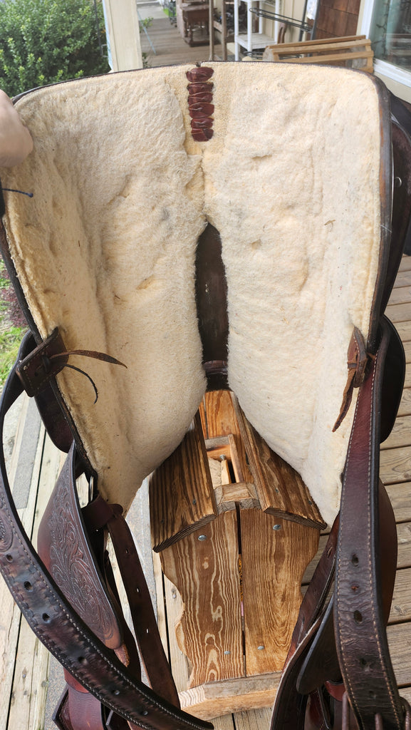 This is a Crates Western Equitation Show Saddle in excellent used condition. This saddle features lovely floral tooling and silver accents. It comes equipped with a latigo, off billet, and flank straps.