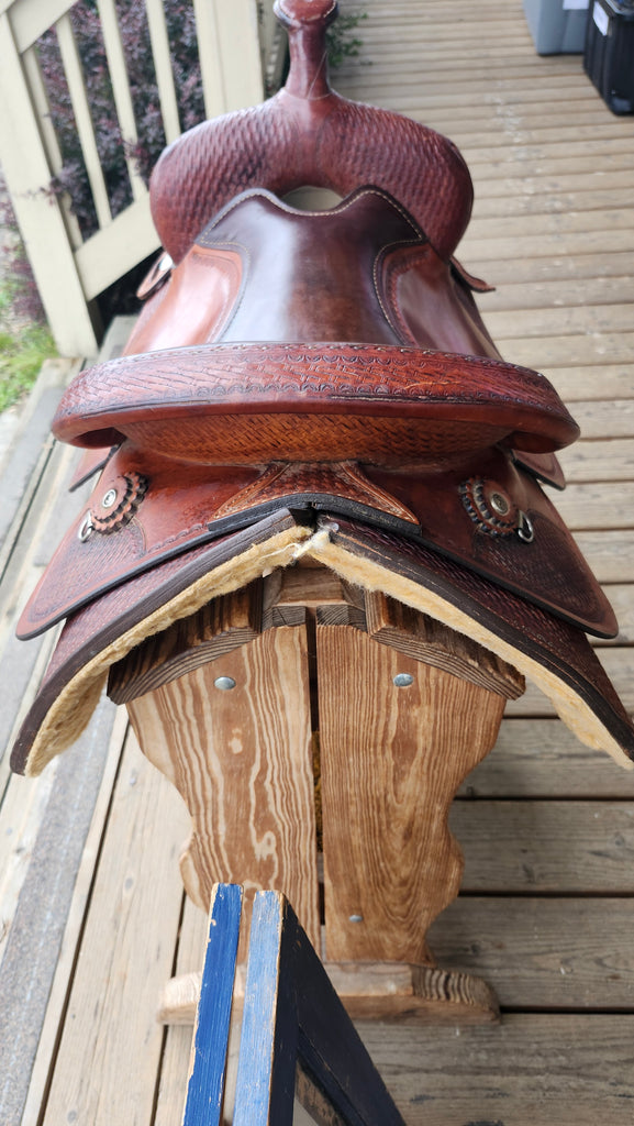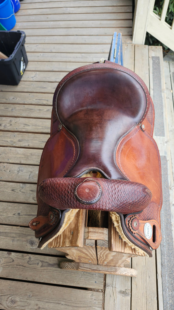 This is a Western Crates western trail saddle in good used condition. This saddle features basketweave accents and a roughout seat. It comes equipped with a latigo and off billet. Unfortunately this saddle's model number does not come up in the crates saddle archives, so all measurements are an estimate.