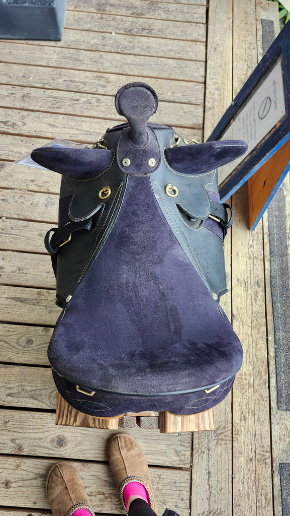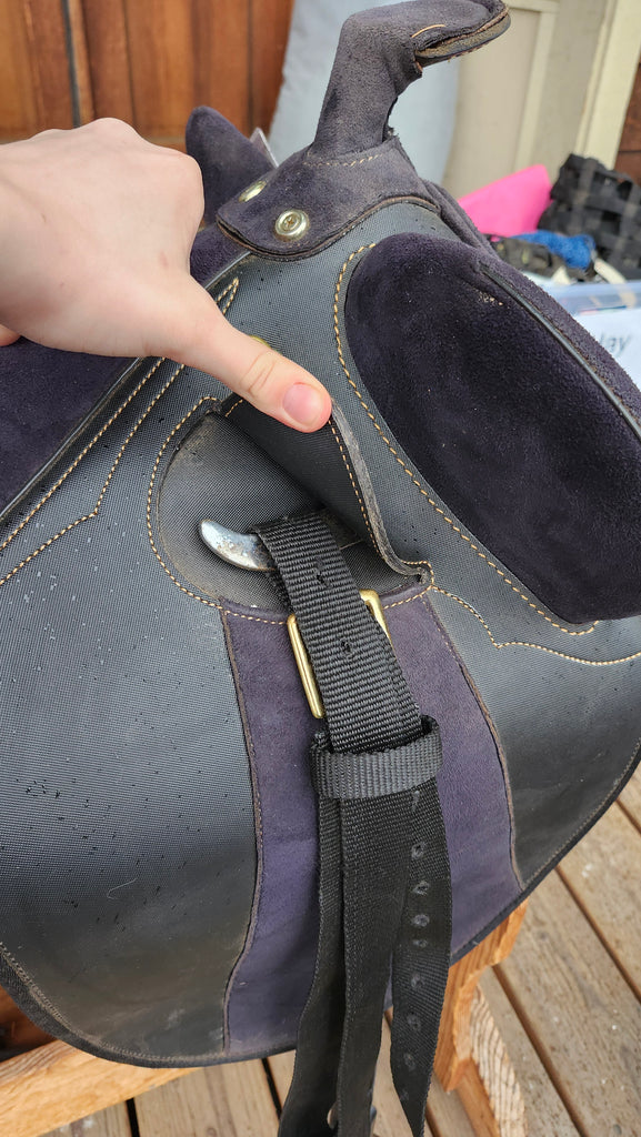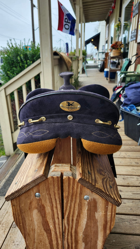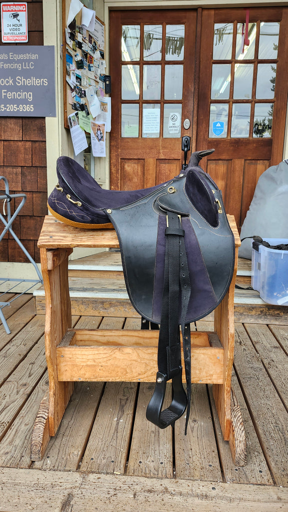 This is a Down Under Supply Synthetic Australian Saddle in good used condition. This saddle is a great option for a rider looking for a durable lightweight saddle. It comes equipped with stirrups and nylon stirrup leathers.