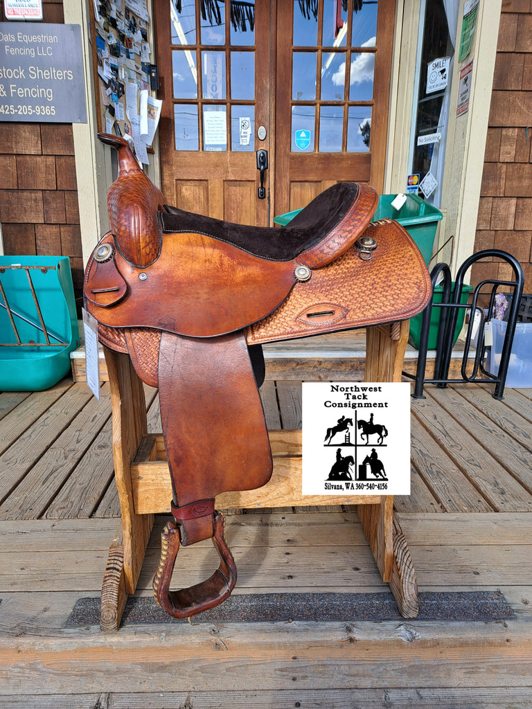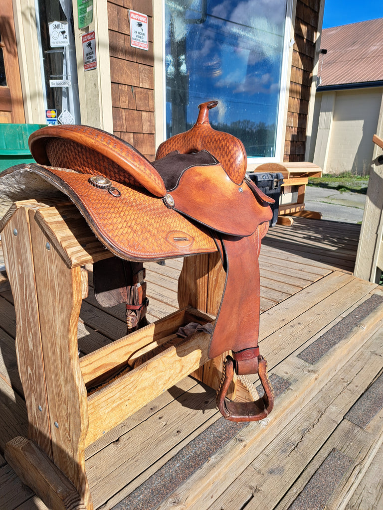 This is a Hereford Tex Tan All Around western saddle in good used condition. This saddle was recently inspected and had the blevins buckles turned to keep the excess fender out of your way. It features attractive basketweave stamping and ropewrapped conchos.