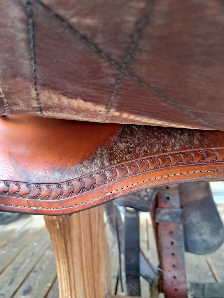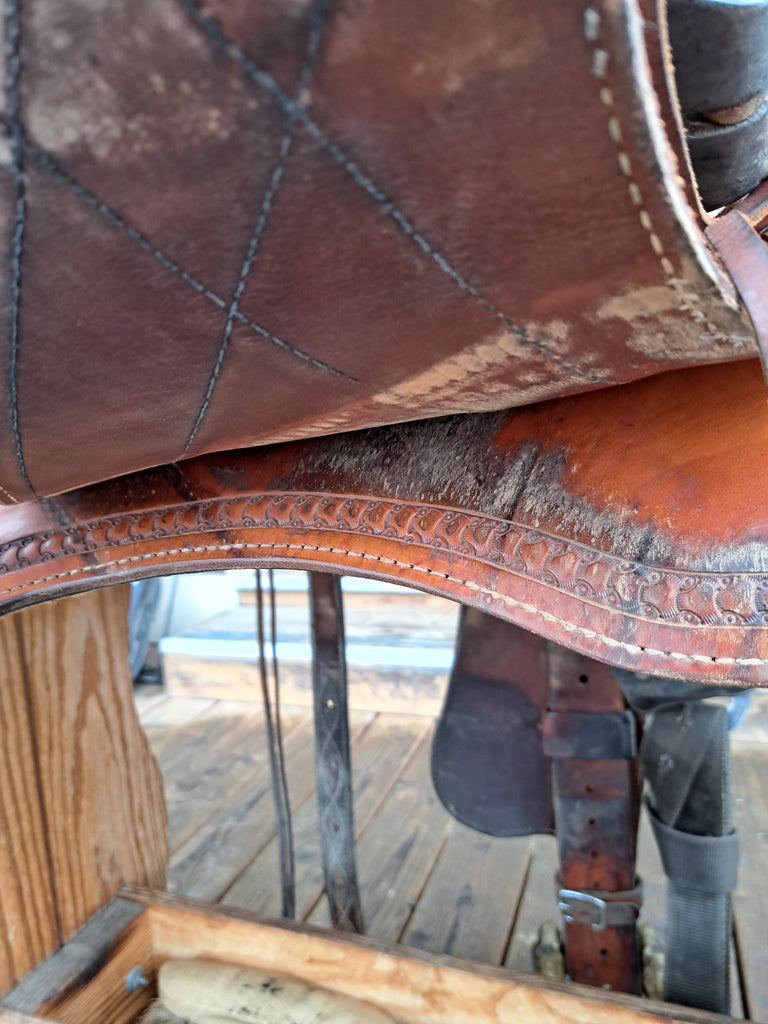 This is a Ortho-flex Range Roper Ranch Saddle in great used condition. This saddle features a flex panel tree that adjusts to fit most horses. It comes equipped with a latigo, off billet, and rear cinch with billets.