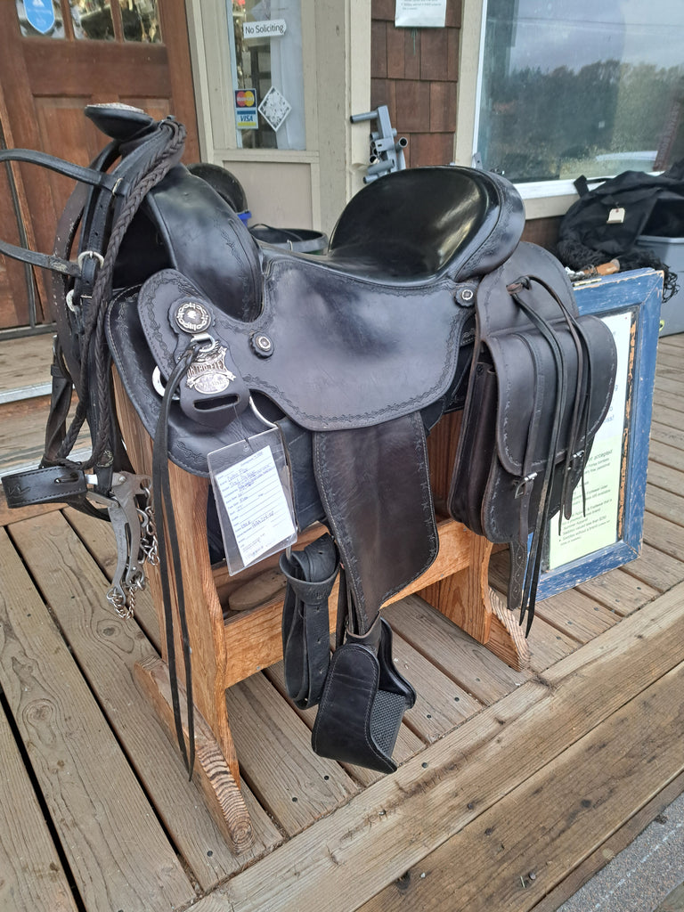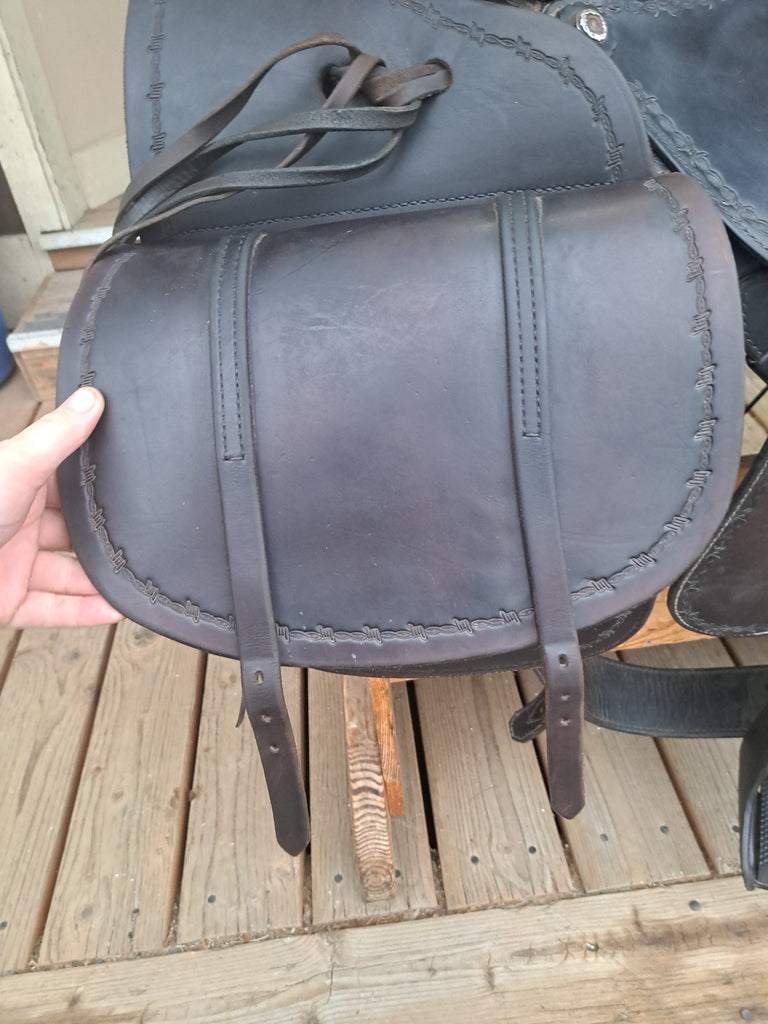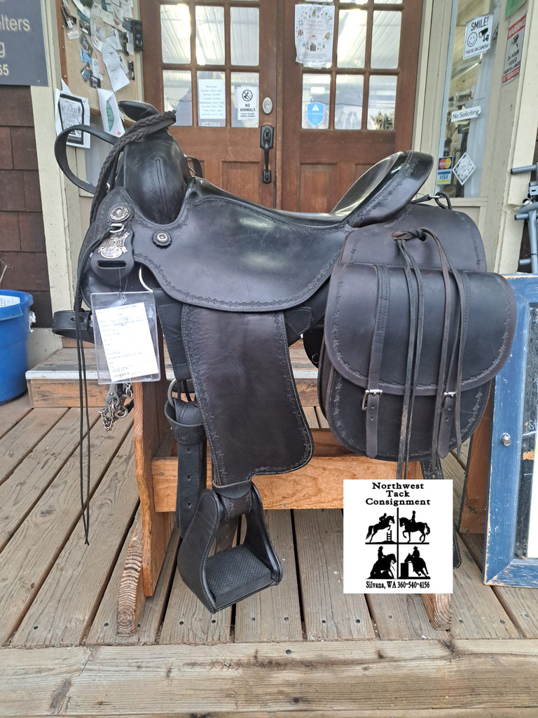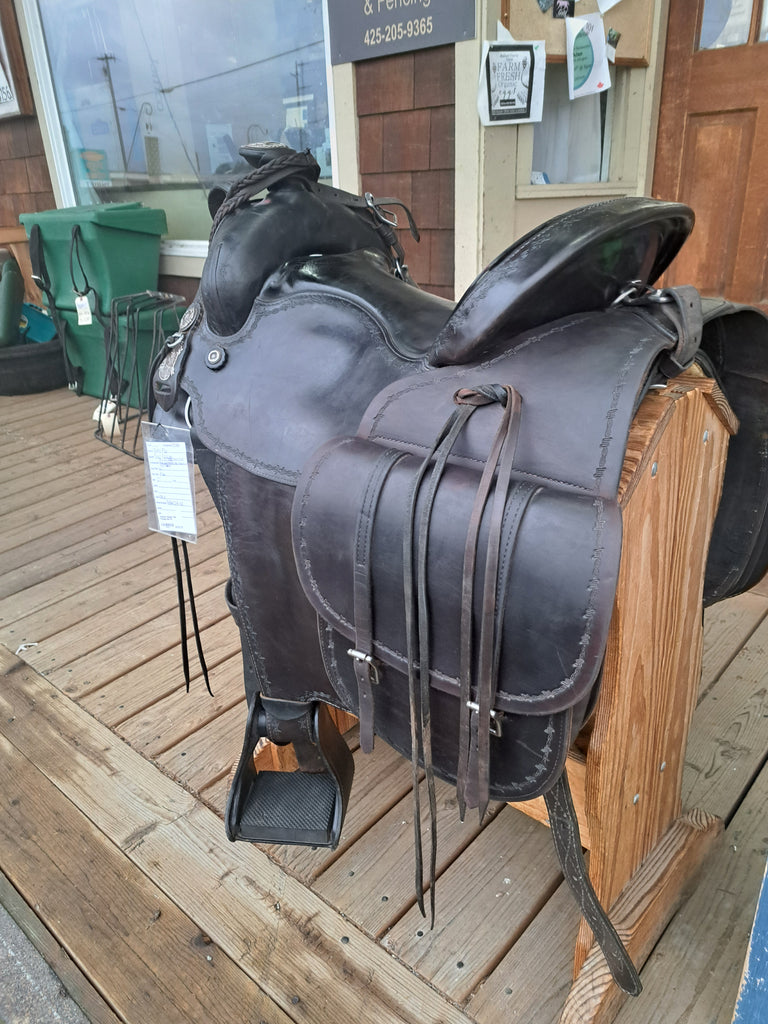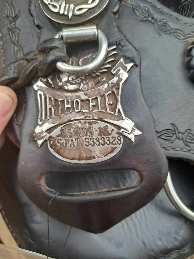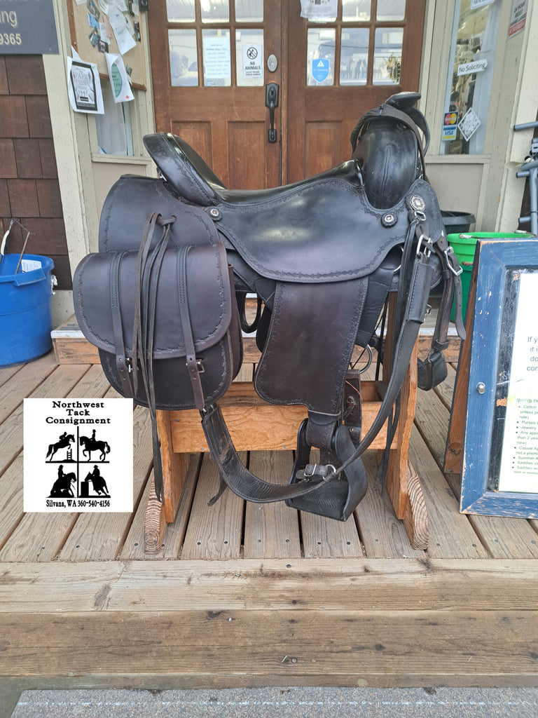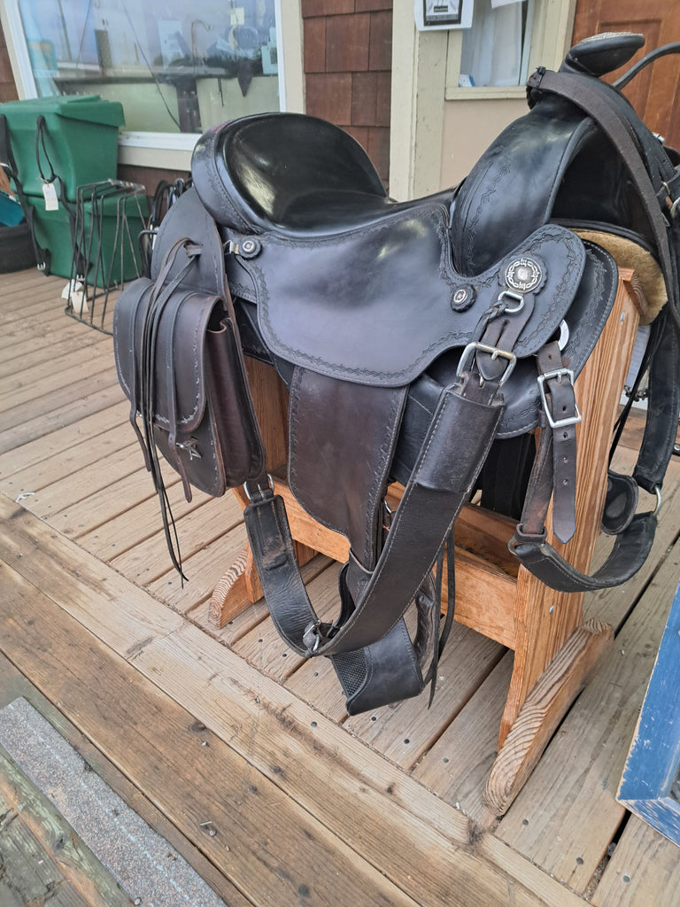 This Ortho Flex Trail Package will be just about everything you need to get out of the trails! It has been well cared for and is in good used condition. It features barbed-wire tooling with matching conchos. It comes with an off-billet, latigo, rear cinch, saddle bags, breast collar, headstall w/ reins, and a cruper.