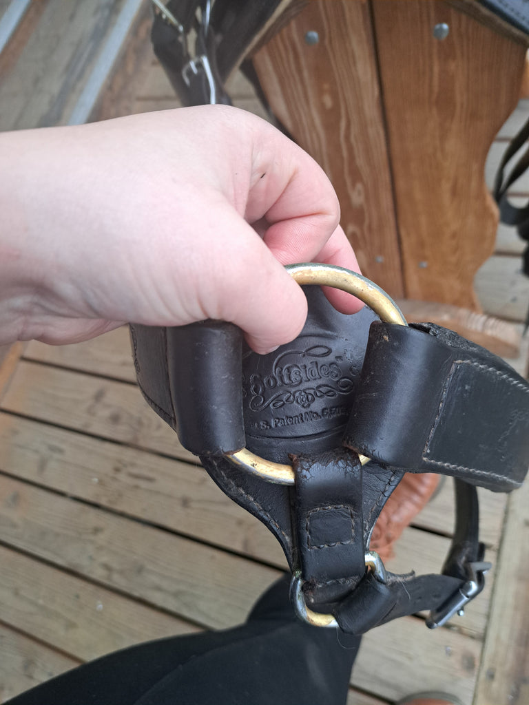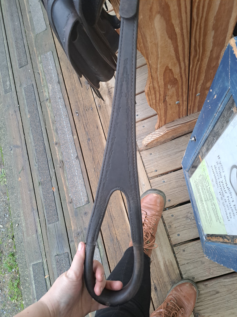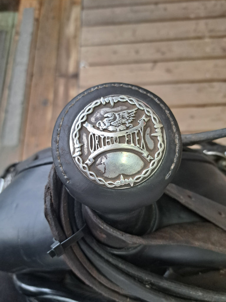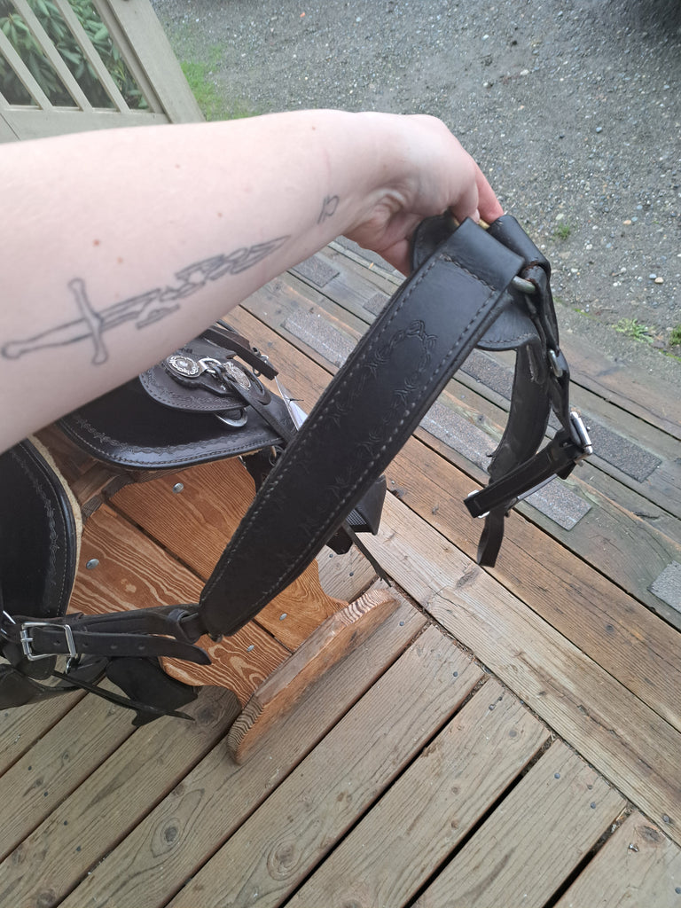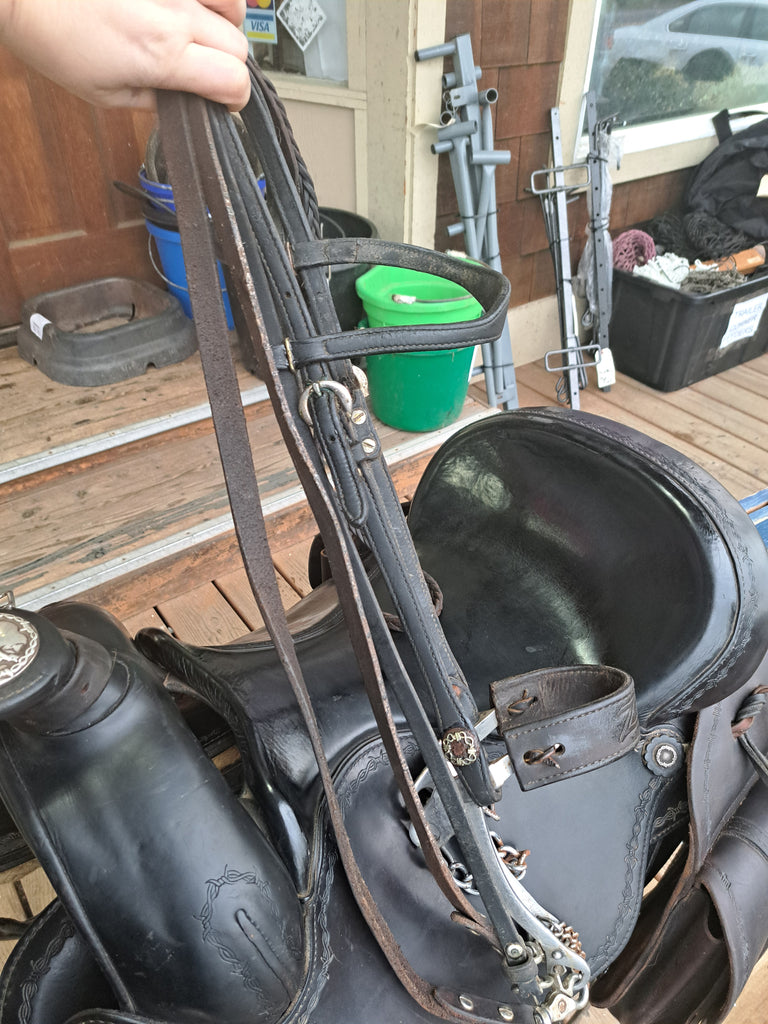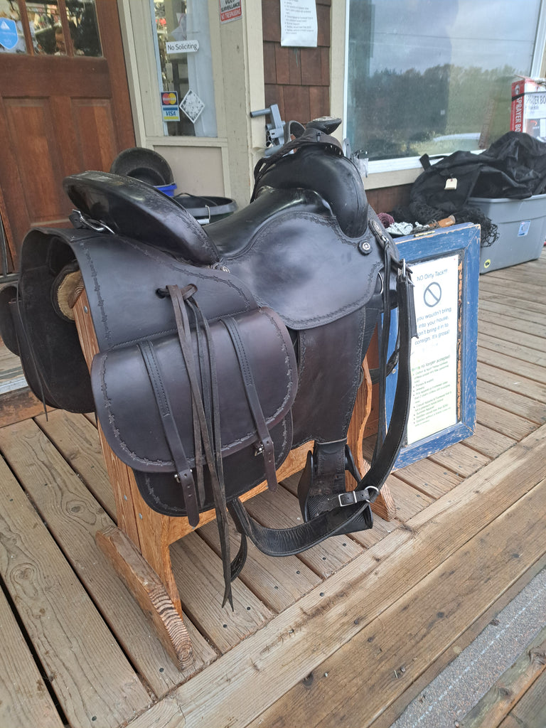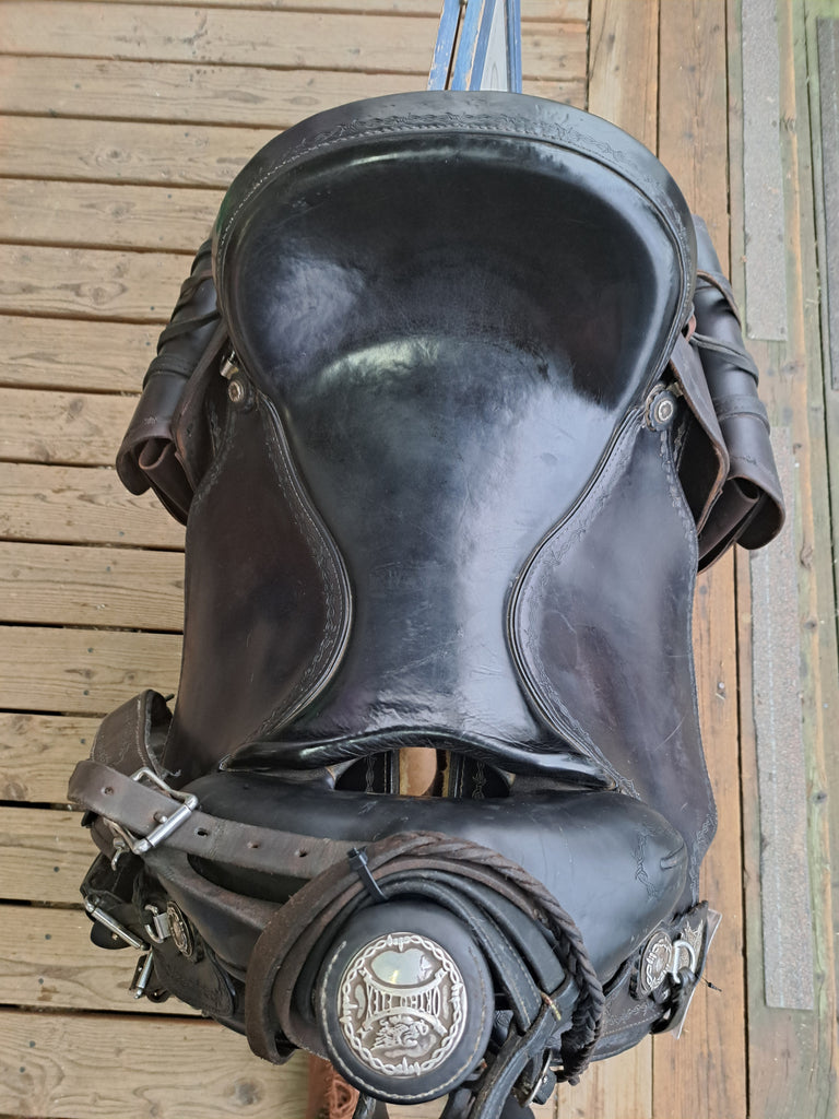 This Ortho Flex Trail Package will be just about everything you need to get out of the trails! It has been well cared for and is in good used condition. It features barbed-wire tooling with matching conchos. It comes with an off-billet, latigo, rear cinch, saddle bags, breast collar, headstall w/ reins, and a cruper.