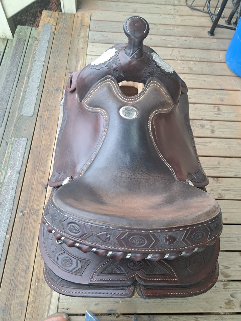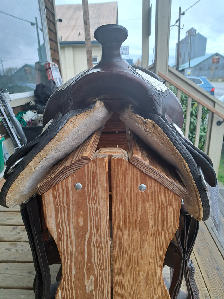 This is a Rocking R Western Pleasure Saddle in excellent used condition. This saddle is made with soft and supple leather, and has been well maintained. It features silver accents, and an aztec border. It comes equipped with a latigo and off billet.