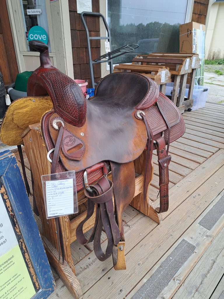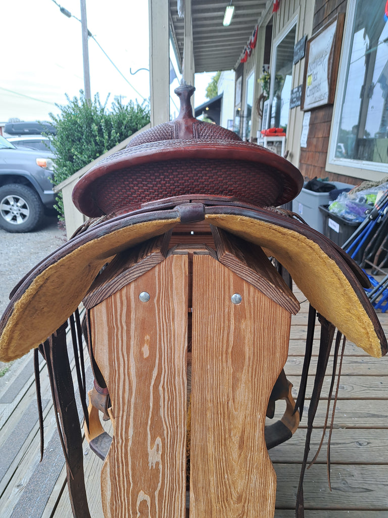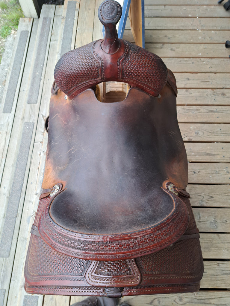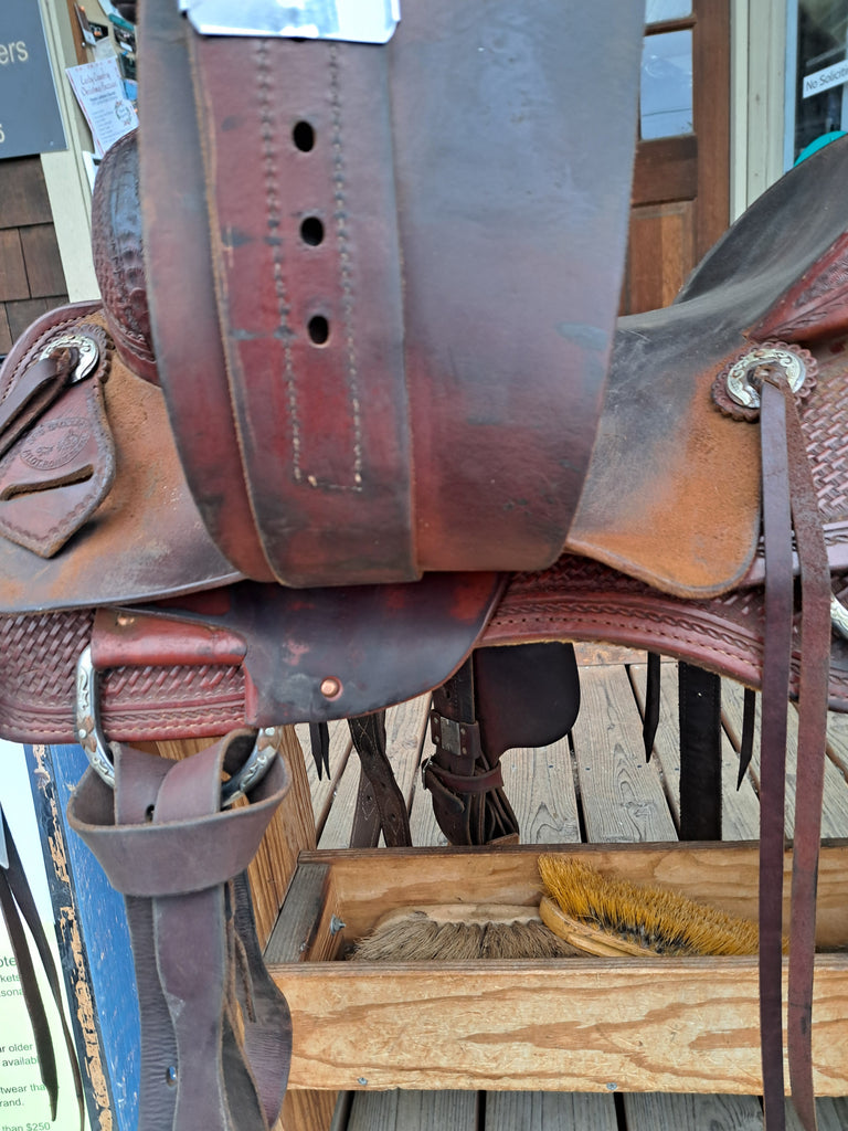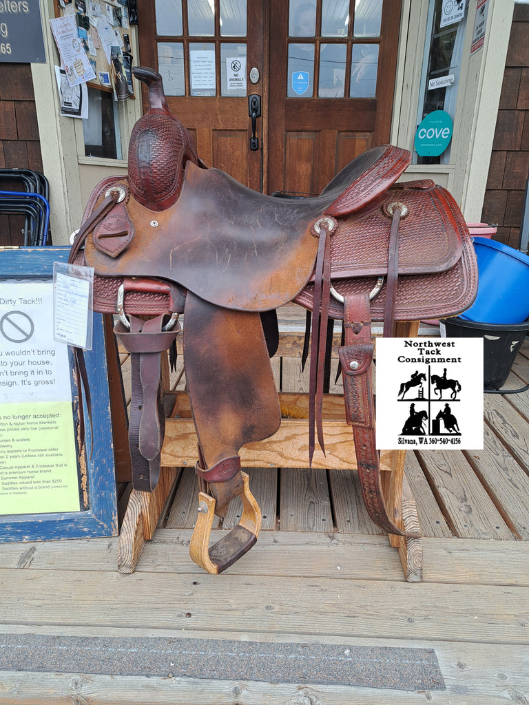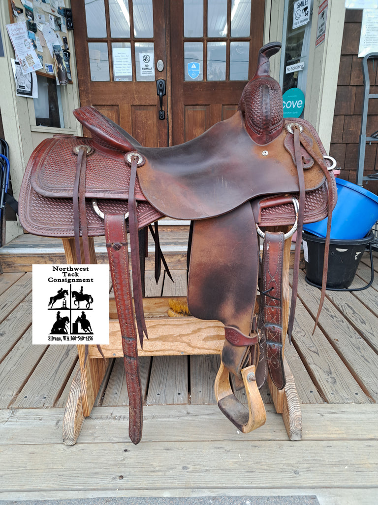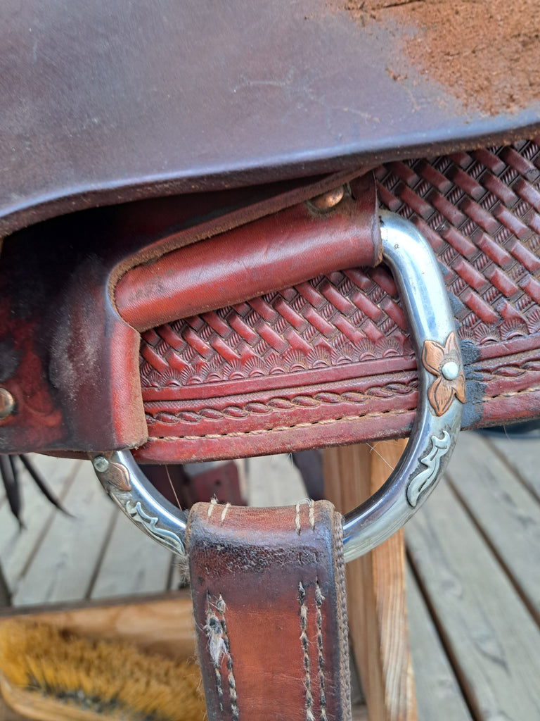 This SRS Saddlery Cutter Saddle has been well cared for and is in good used condition. It features basket weave tooling, floral accent conchos and matching accents on the d-rings. It comes with a latigo, off-billet, and flank straps.