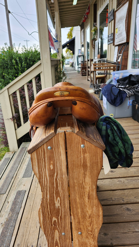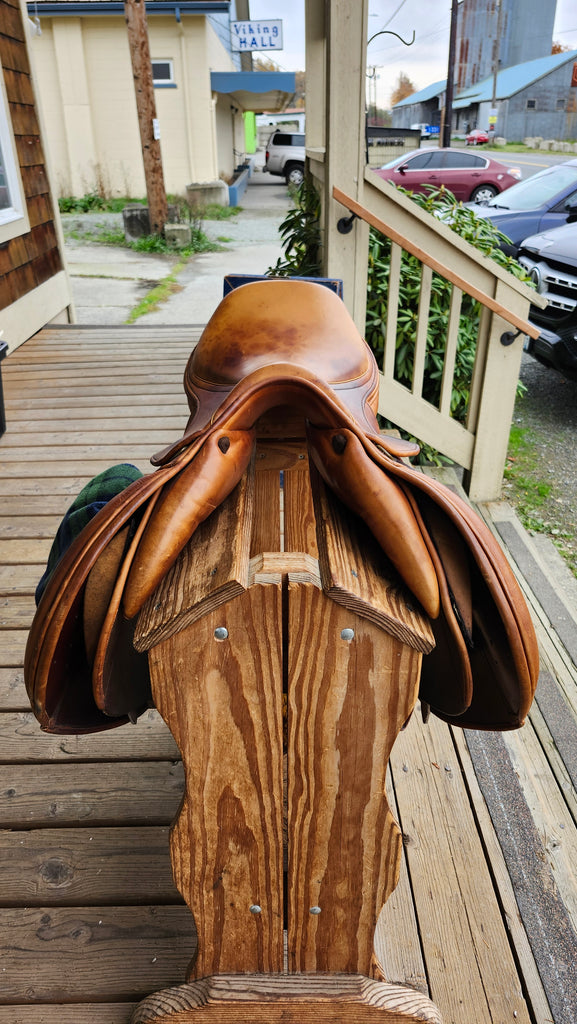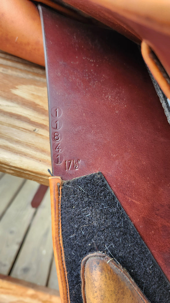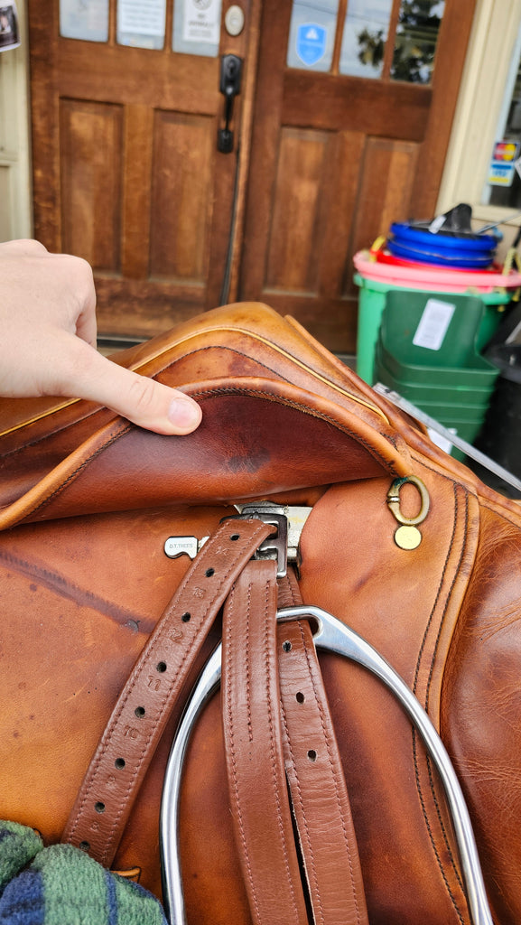 This is a Crosby close contact english saddle in good used condition. The leather is discolored but the leather is soft and supple and has been well maintained. This saddle would look amazing if it got darkened. It comes equipped with leathers, irons, and a fleece cover.