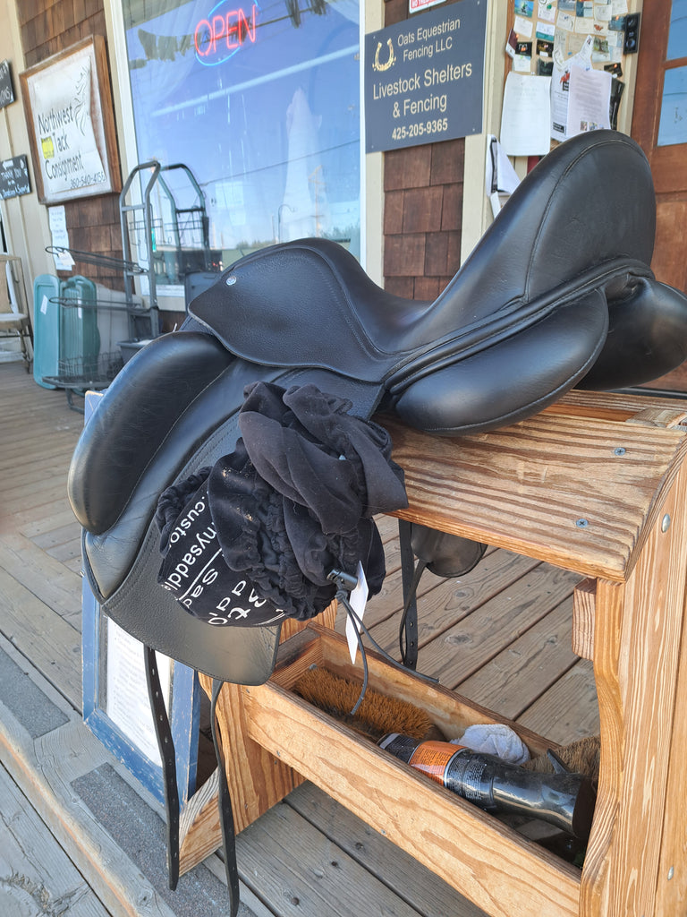 This is a Custom Saddlery Advantage R Monoflap Dressage Saddle in good used condition. This saddle features a generous thigh block and deep padded seat. It shows regular wear including minor scuffs and scratches. It comes with a custom saddlery cover.