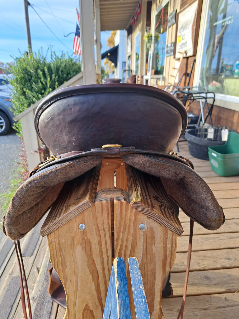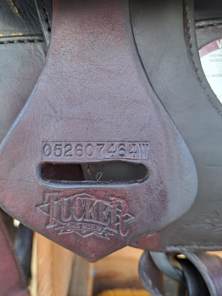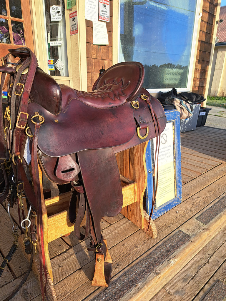 This Tucker Western Trail Saddle has been well cared for and is in good used condition. It comes with an off-billet, latigo, breast plate, reins, and a headstall with a shank bit.