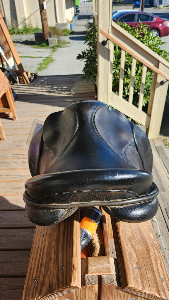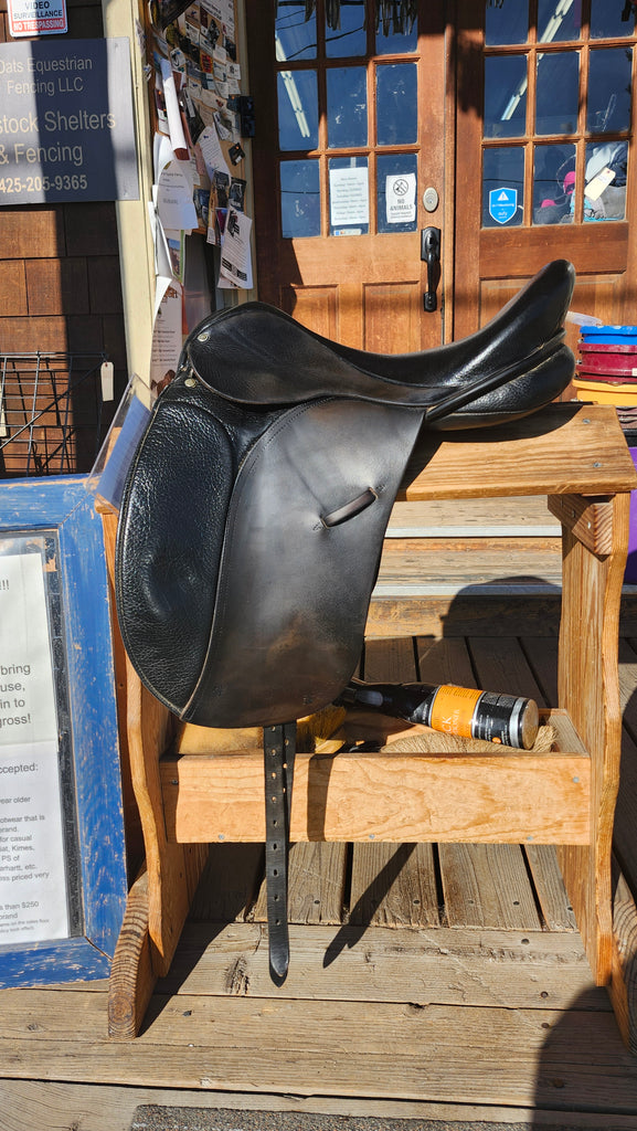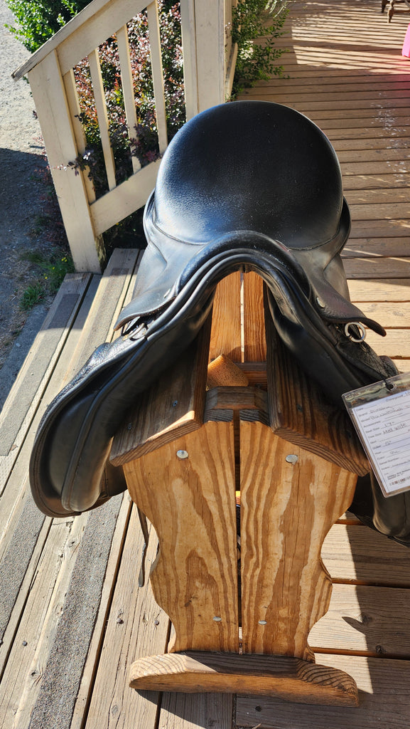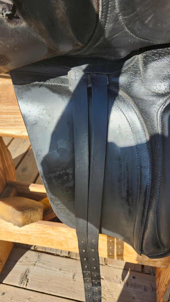 This 17" Ainsley pro National Dressage in in good used condition. The saddle does show some wear which is usual for a saddle of its age. It is noted that the saddle also has a narrow twist.