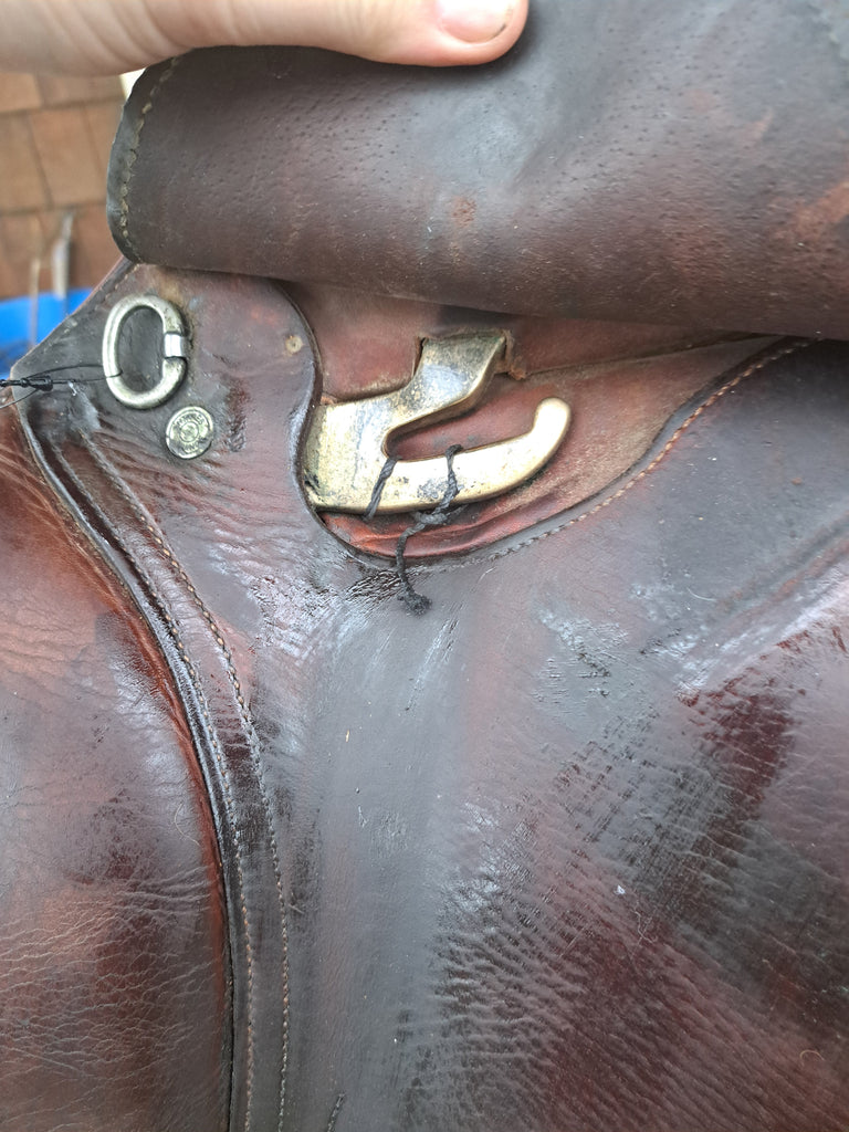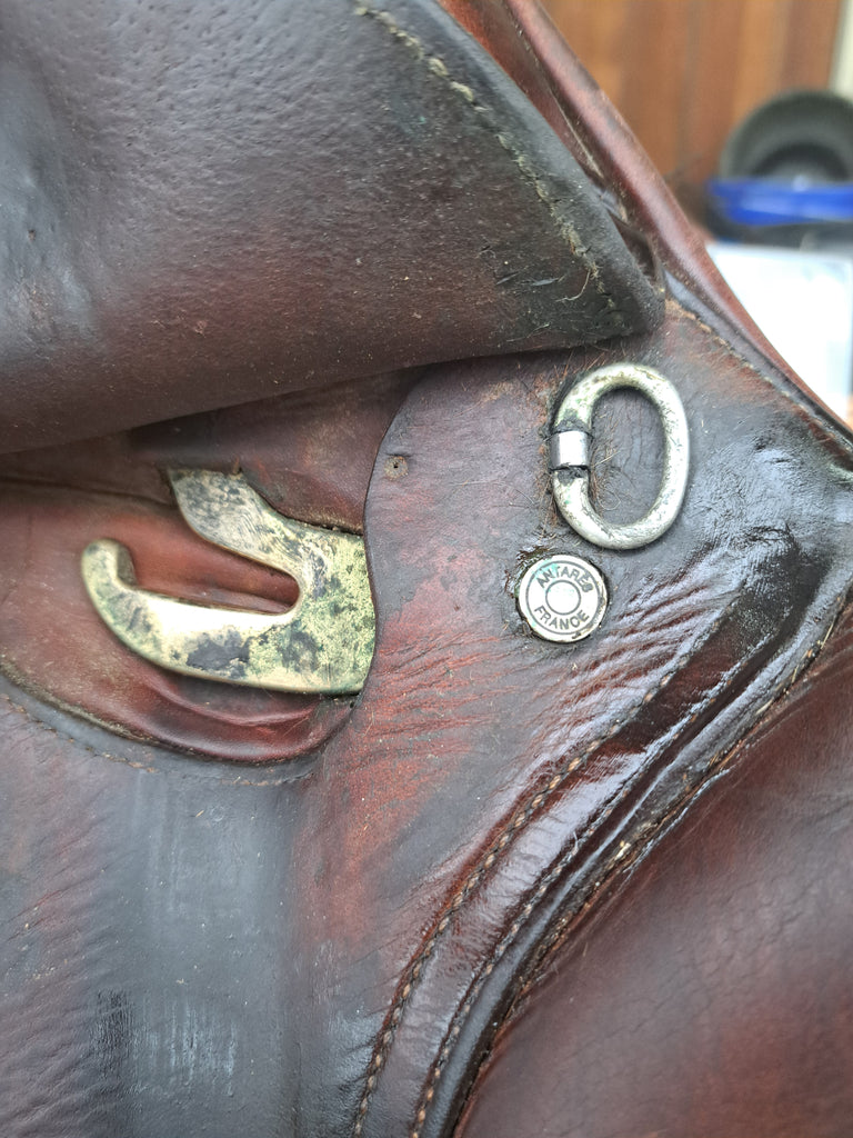 This is a well used, but well cared for 17" Antares Jump/Close Contact Saddle in great condition. This saddle features soft, sticky leather and front and rear leg blocks for added security.