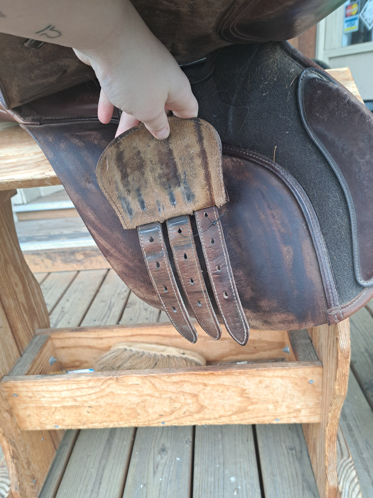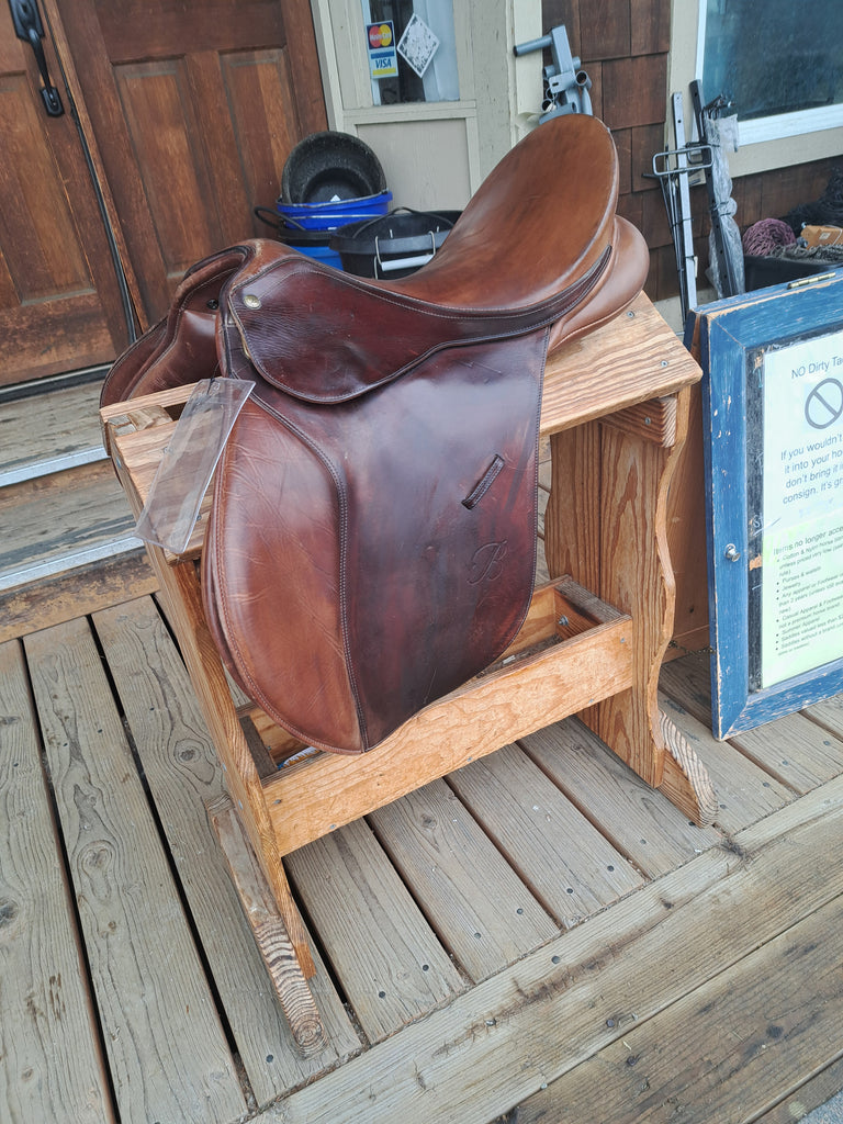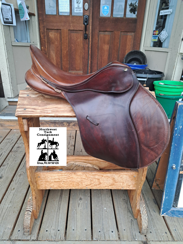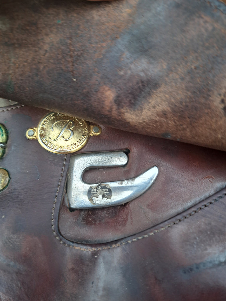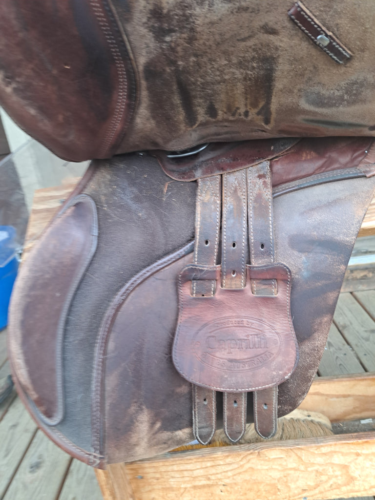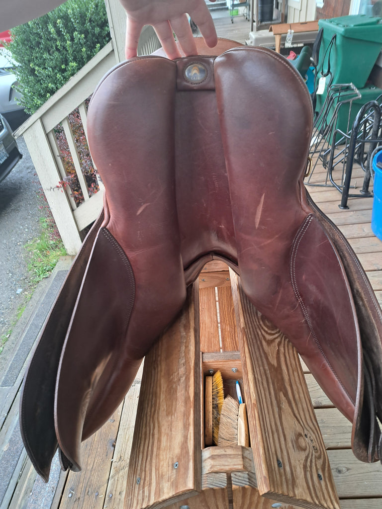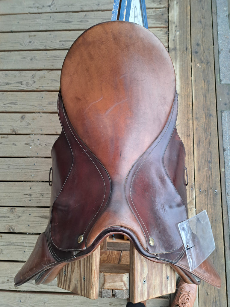 This Bates Caprilli Close Contact Saddle is in good used condition, showing minor cosmetic scratches. It features the EASY Change gullet system.