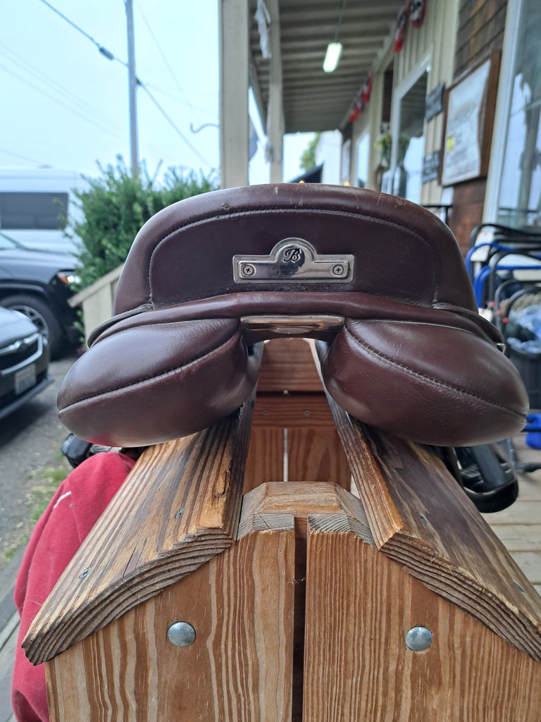 This Bates Close Contact Saddle has been well cared for and is in good used condition, showing normal signs of wear. It comes with leathers, irons, and a saddle cover. This saddle features the Easy-Change gullet system.