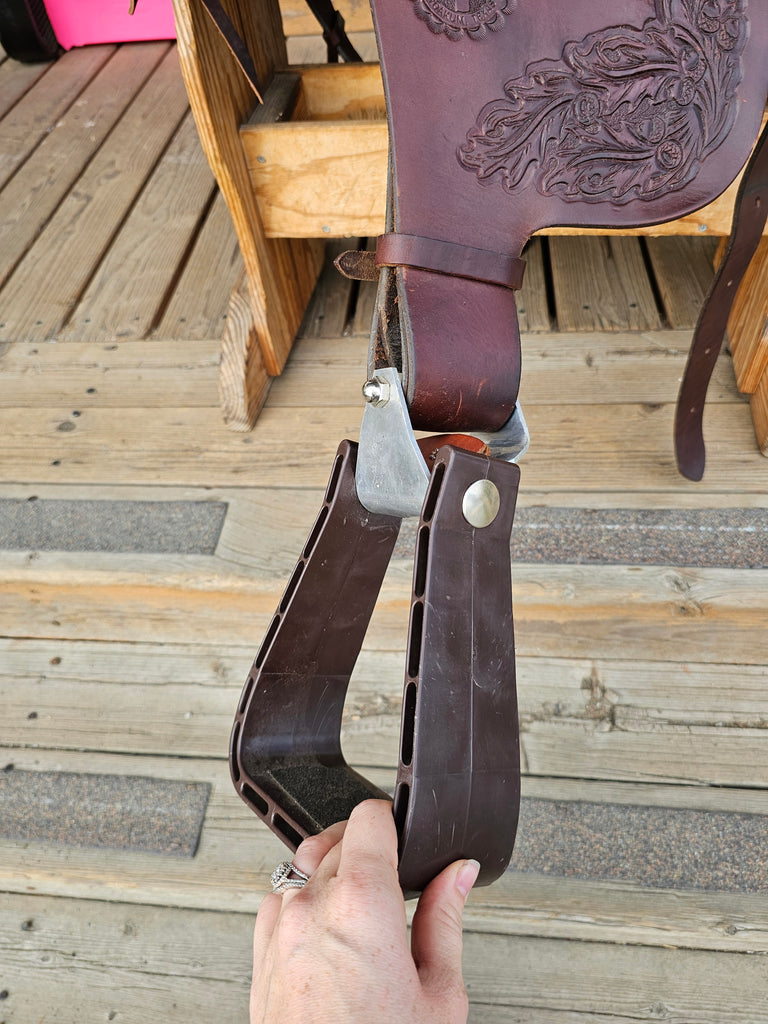 This saddle comes equipped with two latigos, a rear cinch, and stirrup turners.